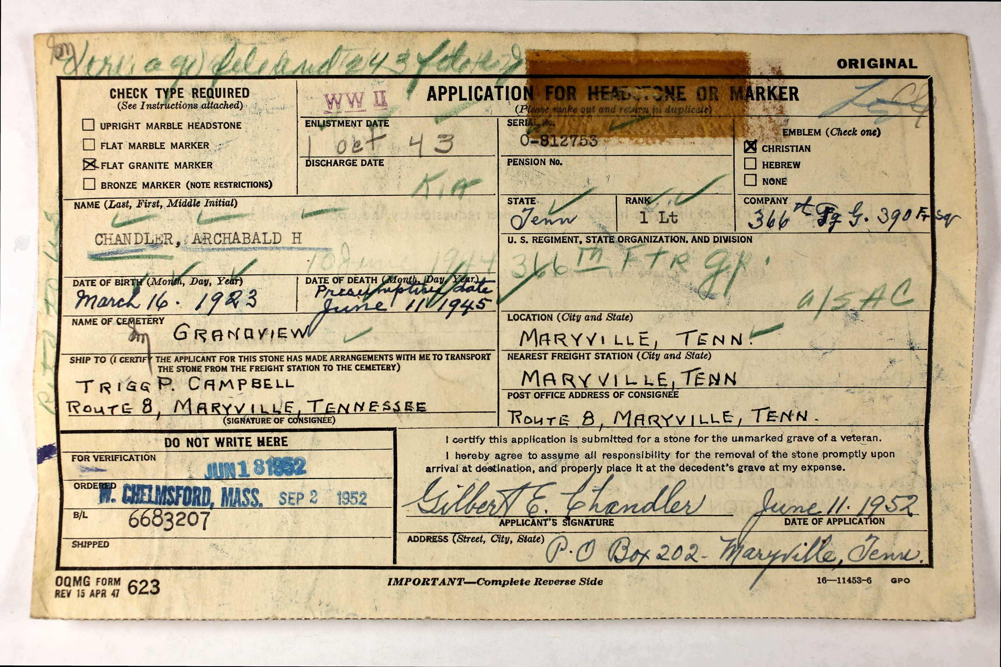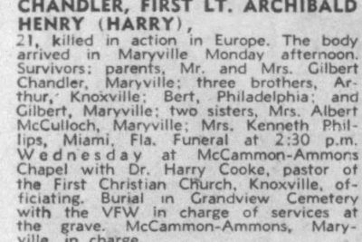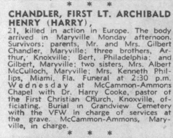 First Lt. Archibald Henry (Harry) Chandler, 21, killed in action in Europe. The body arrived in Maryville Monday afternoon. Survivors: parents, Mr. and Mrs. Gilbert Chandler, Maryville; three brothers, Arthur, Knoxville; Bert, Philadelphia; and Gilbert, Maryville; two sisters, Mrs. Albert McCulloch, Maryville; Mrs. Kenneth Phillips, Miami, Fla.