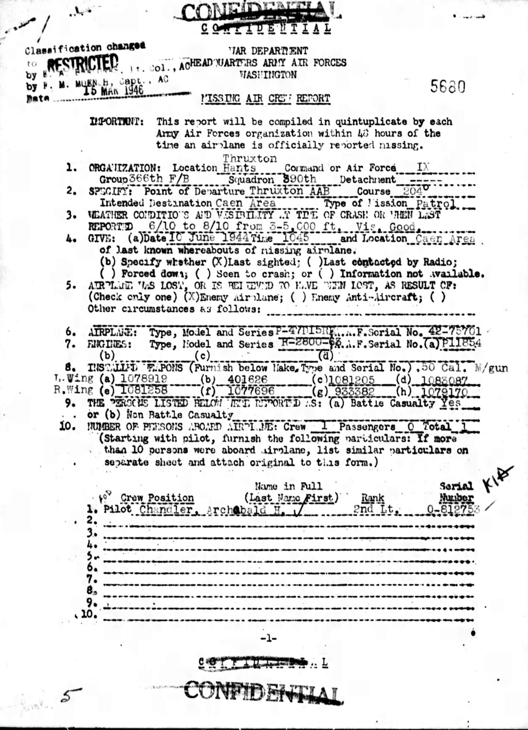 Archabald H. Chandler was the pilot on aircraft P-47D-15RE, serial number 42-75701. He departed from Thruxton Hants AAB and failed to return from a patrol mission to the Caen area in France. He was last sighted near Caen in combat with enemy fighter planes.