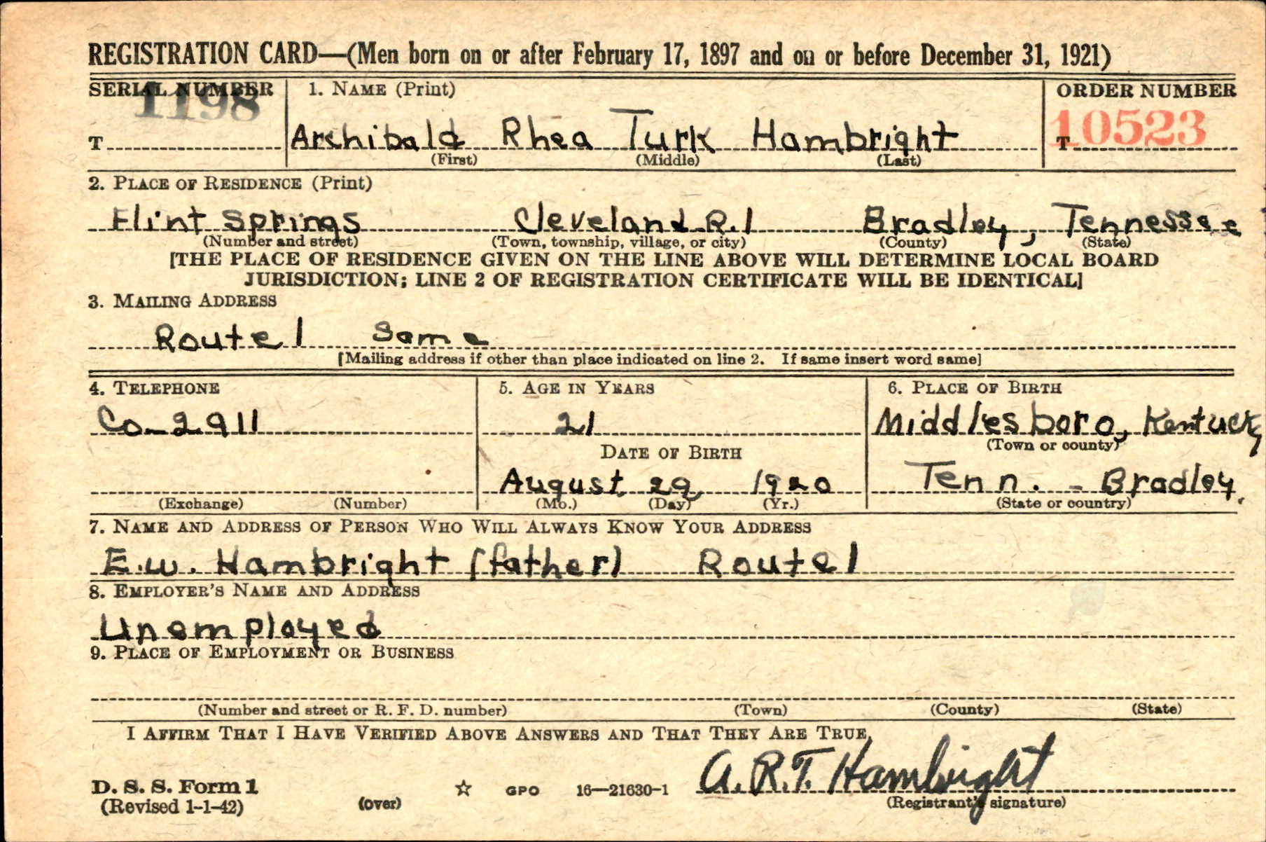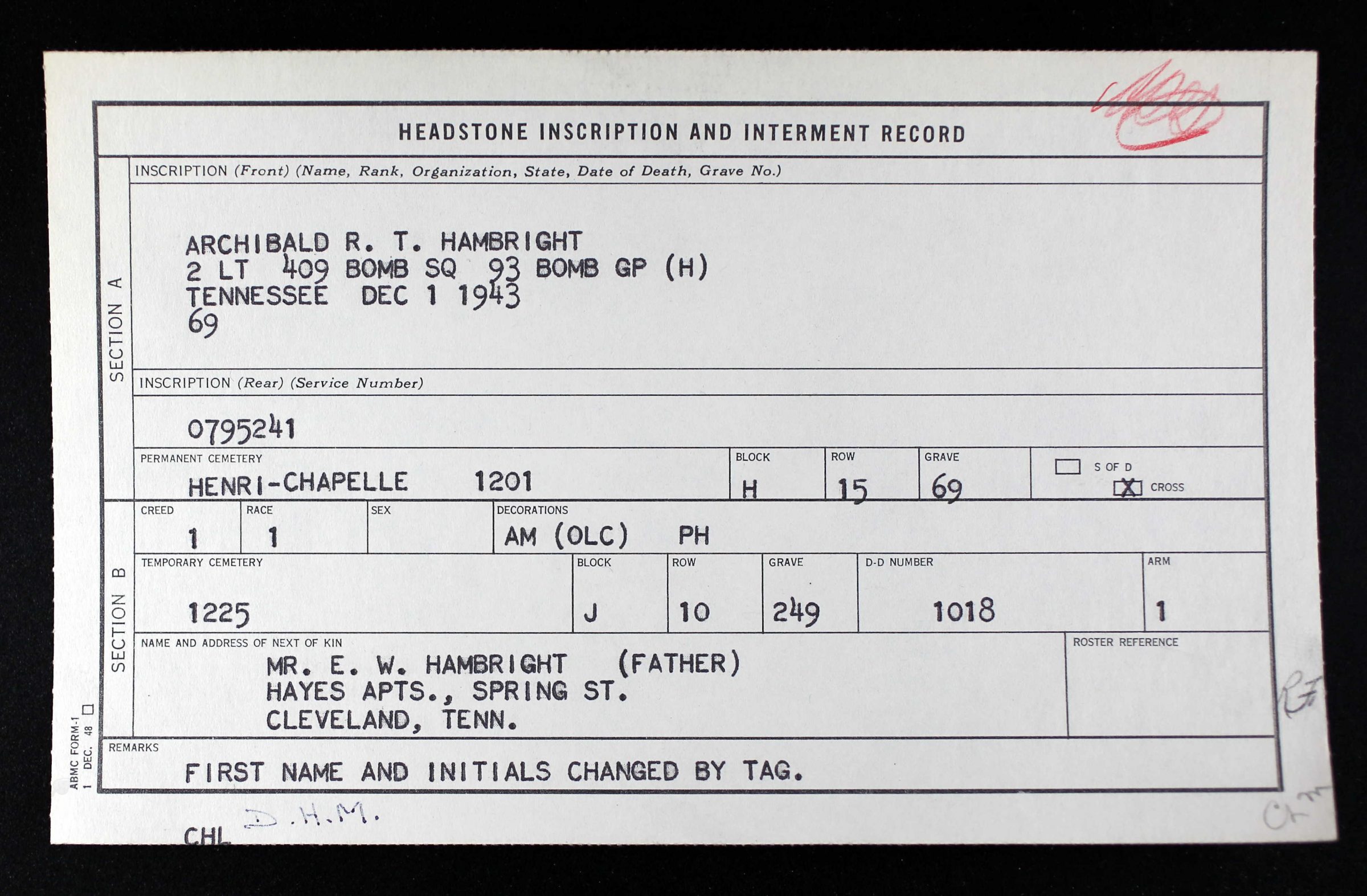 2nd Lieutenant Archibald Rhea Turk Hambright, #O-795241 US Army Air Forces, was born on the 29th of August 1920 in Middlesboro, Kentucky. He was the son of Edward W. and Lila H. Leech Hambright. He had a brother, Edward W. Hambright.