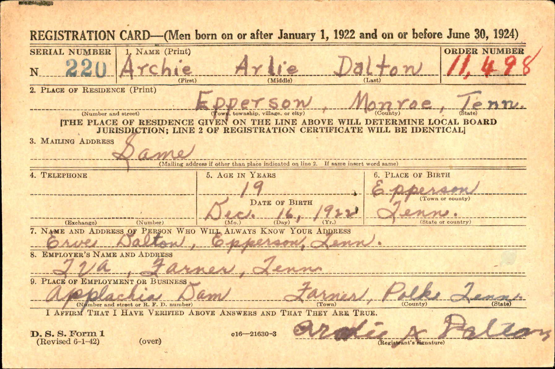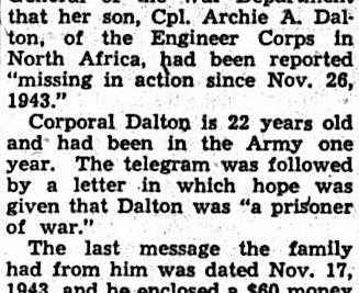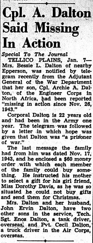 Mrs. Bessie L. Dalton of nearby Epperson, was notified by telegram recently from the Adjutant General of the War Department that her son, Cpl. Archie A. Dalton, of the Engineer Corps in North Africa, had been reported “missing in action since Nov. 26, 1943.” Corporal Dalton is 22 years old and had been in the army one year. The telegram was followed by a letter in which hope was given that Dalton was “a prisoner of war.” The last message the family had from him was dated Nov. 17, 1943 and he enclosed a $60 money order with which each member of the family could buy something. He instructed his mother to select a gift for his girl friend, Miss Dorothy Davis, as he was so situated he could not buy Gifts and sent them for Christmas. Mrs. Dalton and her husband, John Ervin Dalton, have two other sons in the service, Tech. Sgt. Enos Dalton, a tank driver, overseas, and Pvt. Cecil Dalton, a truck driver in the Air Corps, overseas.
