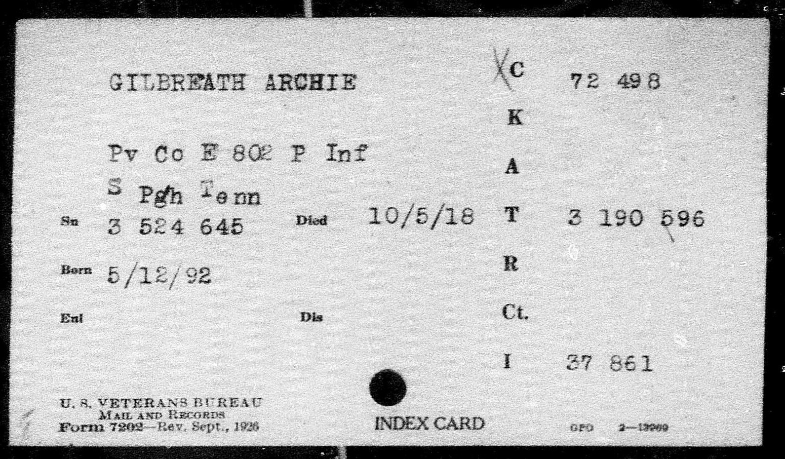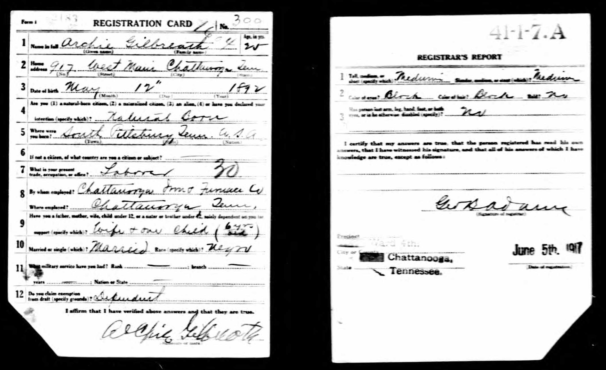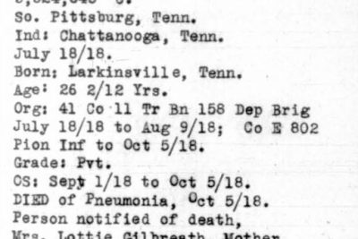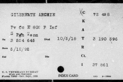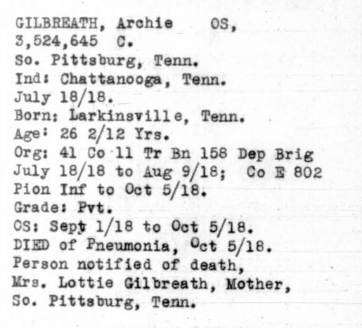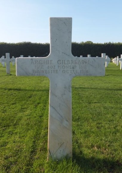 Private Archie Gilbreath was born in Larkinville, Alabama. He was assigned to the 802nd Pioneer Infantry Regiment Colored 95th Infantry Division. He died of pneumonia on 5 October 1918 at the age of 26, and is interred at B,11,15 St Mihiel American Cemetery, Thiaucourt, France.
