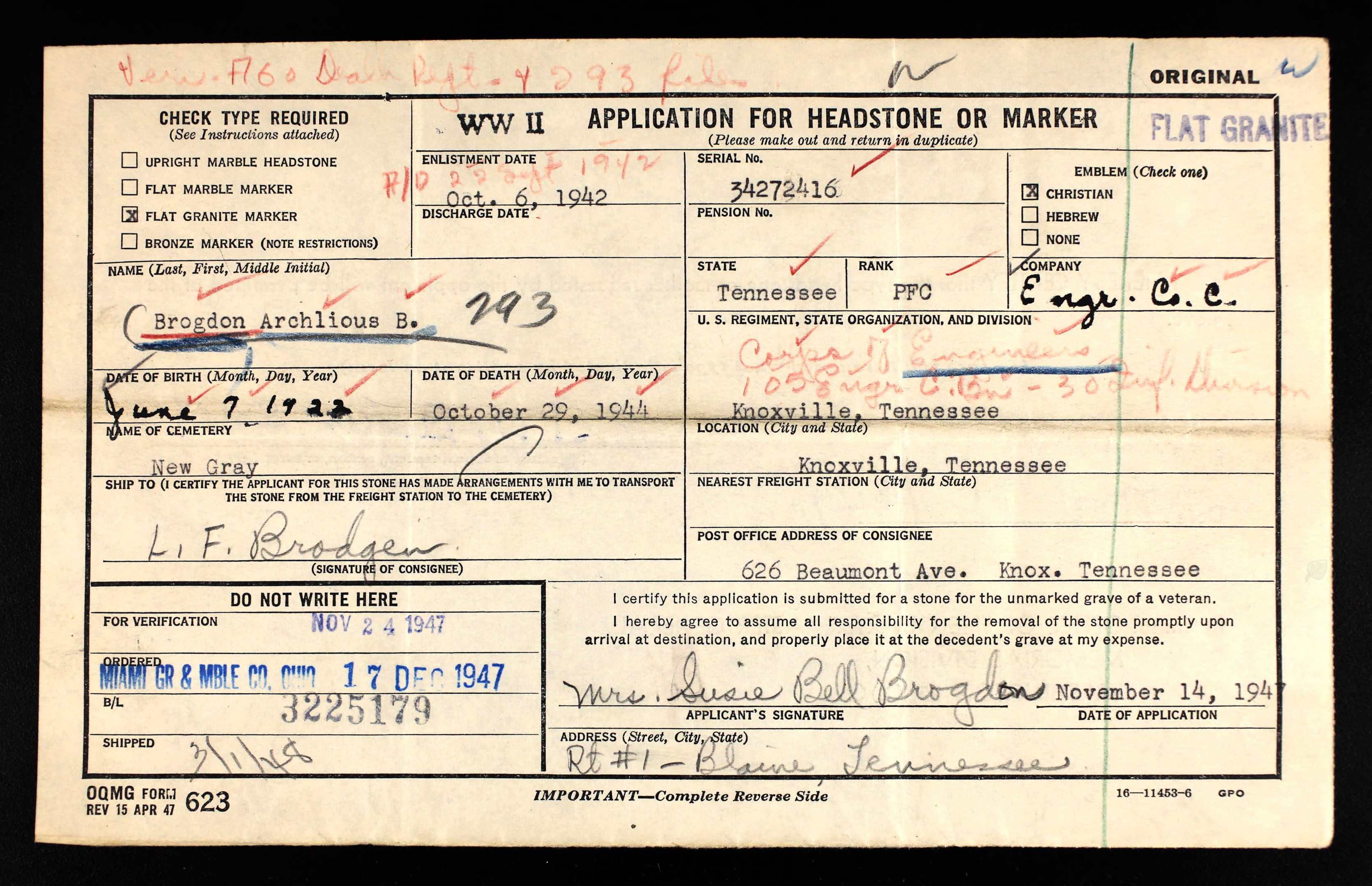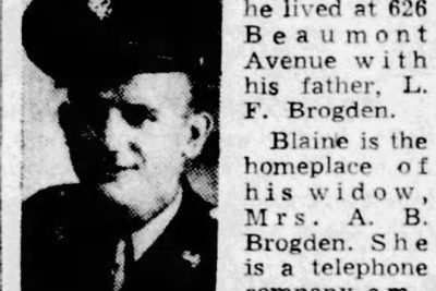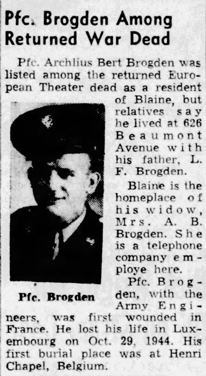 Pfc. Archlius Bert Brogden was listed among the returned European Theater dead as a resident of Blaine, but relatives say he lived at 626 Beaumont Avenue with his father, L.F. Brogden. Blaine is the homeplace of his widow, Mrs. A.B. Brogden. She is a telephone company employe here. Pfc. Brogden, with the Army Engineers, was first wounded in France. He lost his life in Luxembourg on Oct. 29, 1944. His first burial place was at Henri Chapel, Belgium.