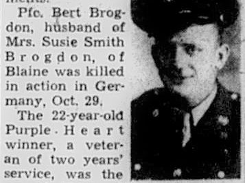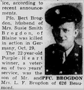 Pfc. Bert Brogdon, husband of Mrs. Susie Smith Brogdon, of Blaine was killed in action in Germany, Oct. 29. The 22-year-old Purple Heart winner, a veteran of two years’ service, was the son of Mr. and Mrs. L.F. Brogdon of 626 Beaumont.
