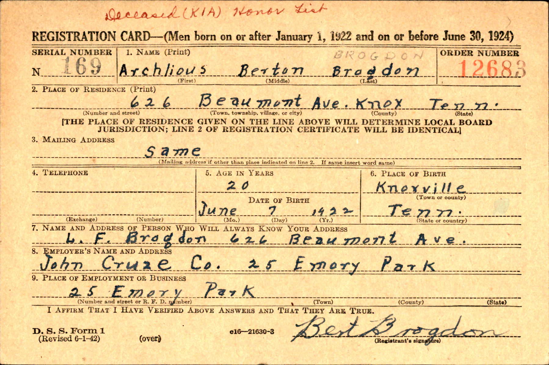 Archlious (Archie) Bert Brogdon was born 7 June 1922 in Knoxville, Tennessee to Lenwood French Brogdon and Clara Edna Magnolia Hansard. He attended Ruhl High School