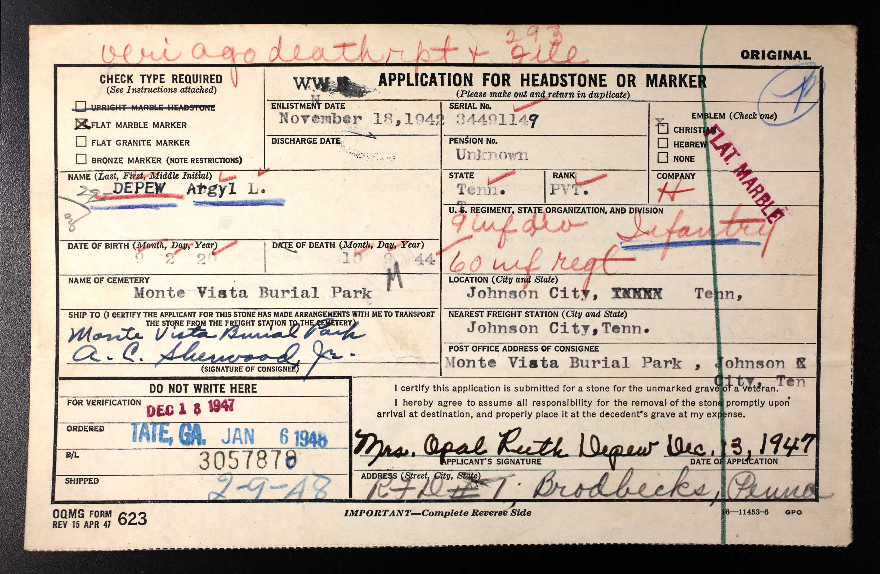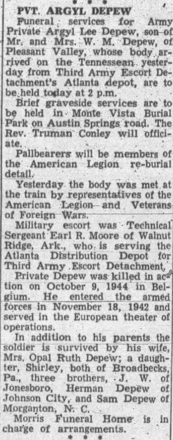 Argyl Lee Depew was born on 2 September 1920 in Gray, Washington County, Tennessee, the son of William Melvin Depew and Laura Ford. He was married to Opal Ruth Humphry and father of Shirley Depew. He entered the armed forces November 18, 1942.