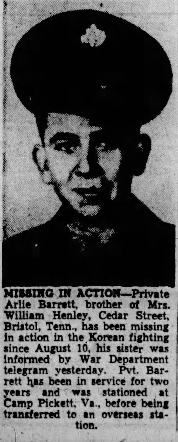 Private Arlie Barrett, brother of Mrs. William Henley, Cedar Street, Bristol, Tenn., has been missing in action in the Korean fighting since August 10, his sister was informed by War Department telegram yesterday. Pvt. Barrett has been in service for two years and was stationed at Camp Pickett, Va., before being transferred to an overseas station.