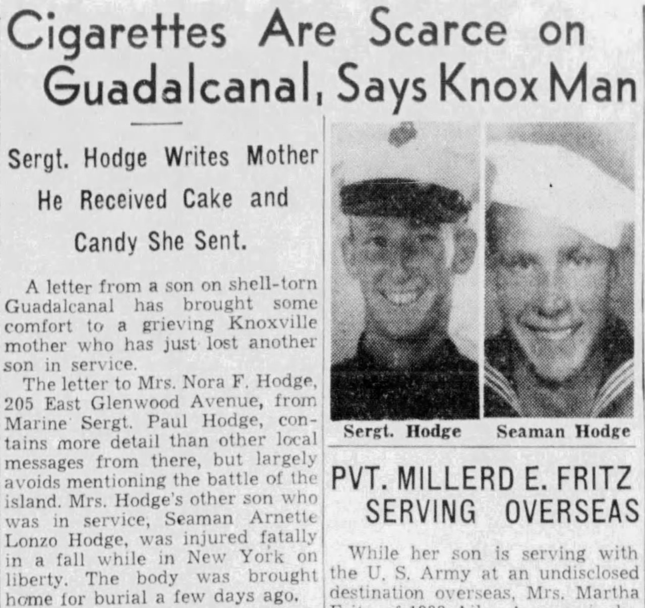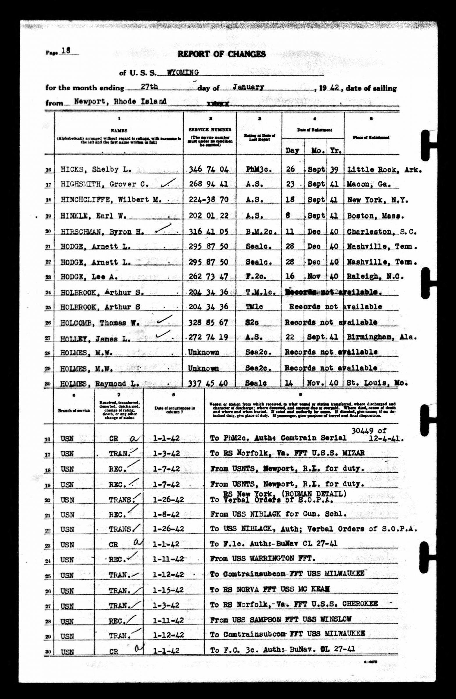 Arnett Hodge served on the U.S.S. Wyoming and on the U.S.S. Niblack. He is buried at Blue Springs Cemetery, Grainger County, Tennessee