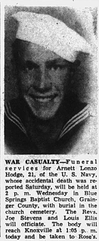 Funeral services for Arnett Lonzo Hodge, 21, of the U.S. Navy, whose accidental death was reported Saturday, will be held at 2 p.m. Wednesday in Blue Springs Baptist Church, Grainger County, with burial in the church cemetery. The Revs. Joe Stevens and Louis Ellis will officiate. The body will reach Knoxville at 1:05 p.m. today and be taken to Rose’s.