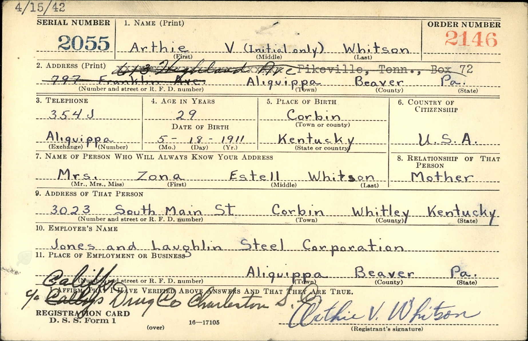Arthie Vertie Whitson was born in Kentucky, the son of Isaac Franklin Whitson and Zona Estell Shiplet. Husband of Jeanette Mansfield and father of George Mansfield Whitson.