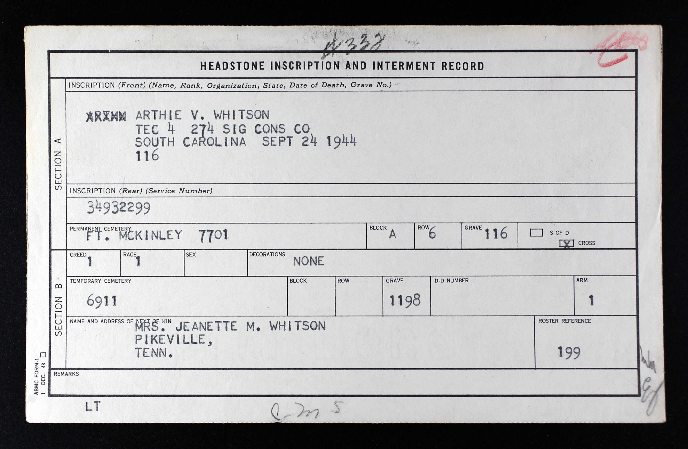 TEC-4 Arthie V. Whitson enlisted out of South Carolina. He served in the 274th Signal Construction Company. He died on 24 September 1944 and is interred at A,6,116, Manila American Cemetery, Philippines.