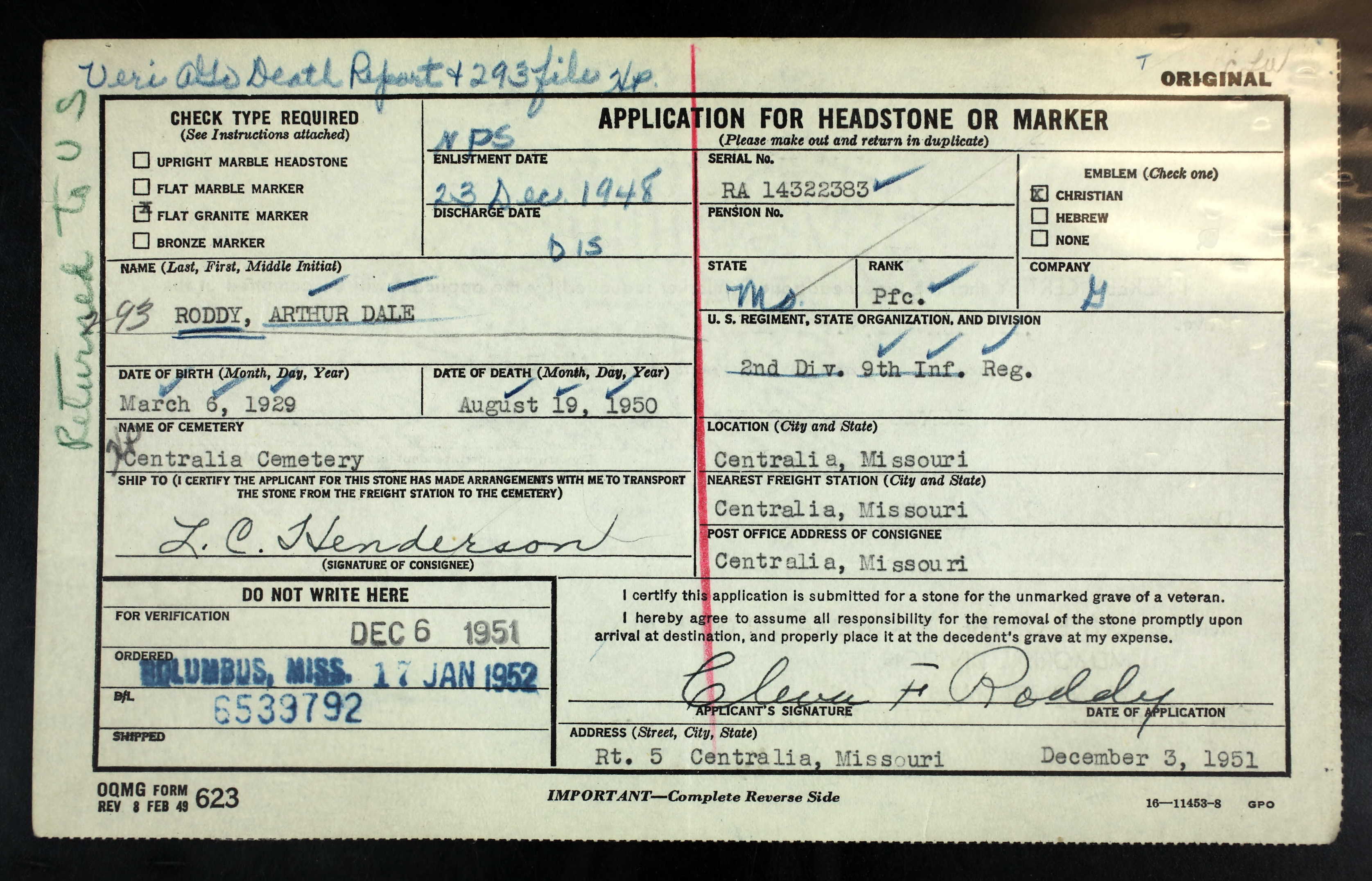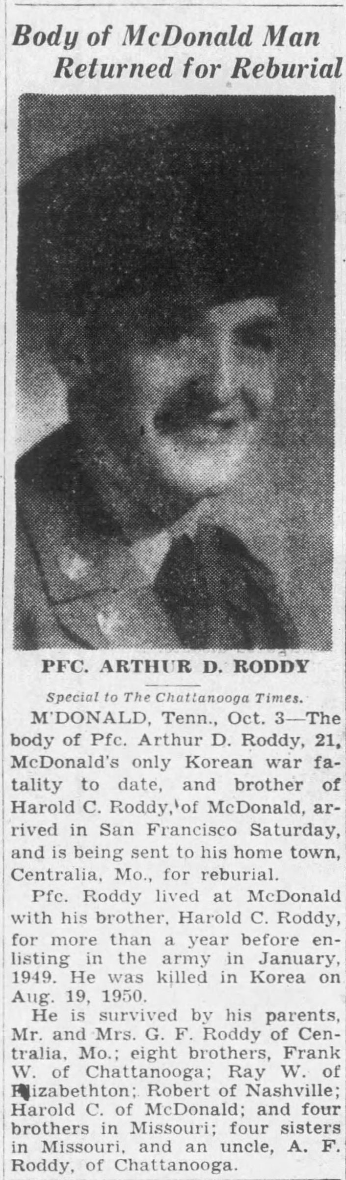 The body of Pfc. Arthur D. Roddy, 21, McDonald’s only Korean war fatality to date, and brother of Harold C. Roddy of McDonald, arrived in San Francisco Saturday and is being sent to his home town Centralia, Mo., for reburial. Pfc. Roddy lived at McDonald with his brother, Harold C. Roddy for more than a year before enlisting in the army in January 1949. He was killed in Korea on Aug. 19, 1950. He is survived by his parents Mr. and Mrs. G.F. Roddy of Centralia, Mo.; eight brothers, Ray W. of Elizabethton; Robert of Nashville, Harold C. of McDonald; and four brothers in Missouri; four sisters in Missouri and an uncle, A.F. Roddy of Chattanooga.