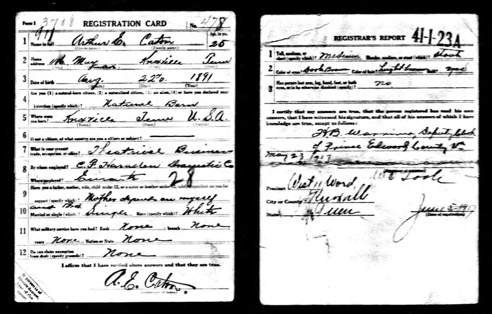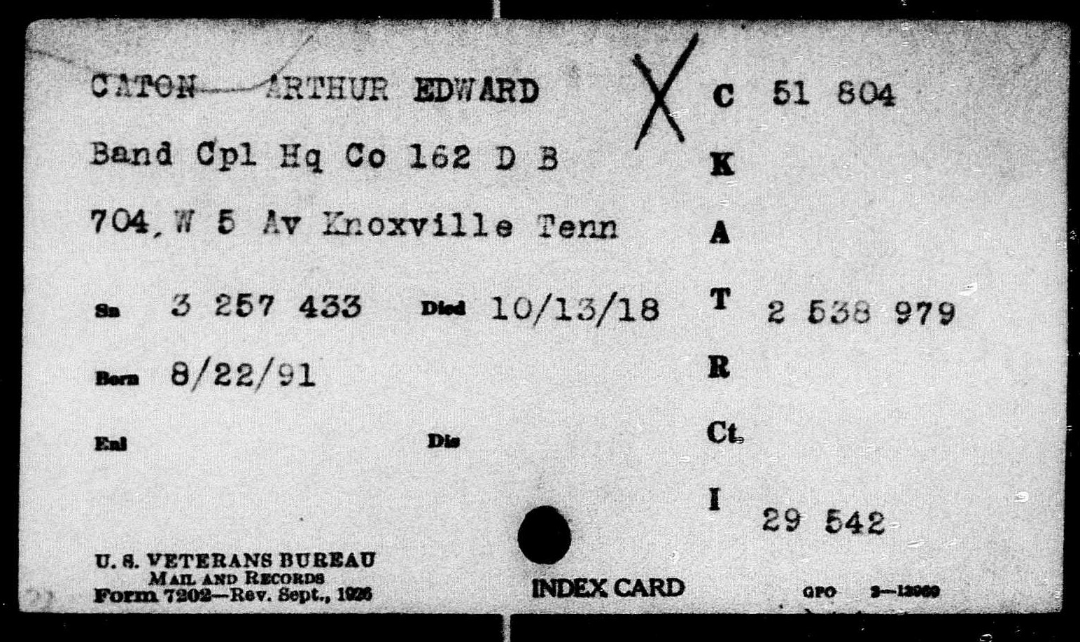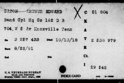 Arthur Edward Caton was born in Knoxville. Prior to entering the service, Arthur was a musician in the theatrical business. He died of lobar pneumonia.