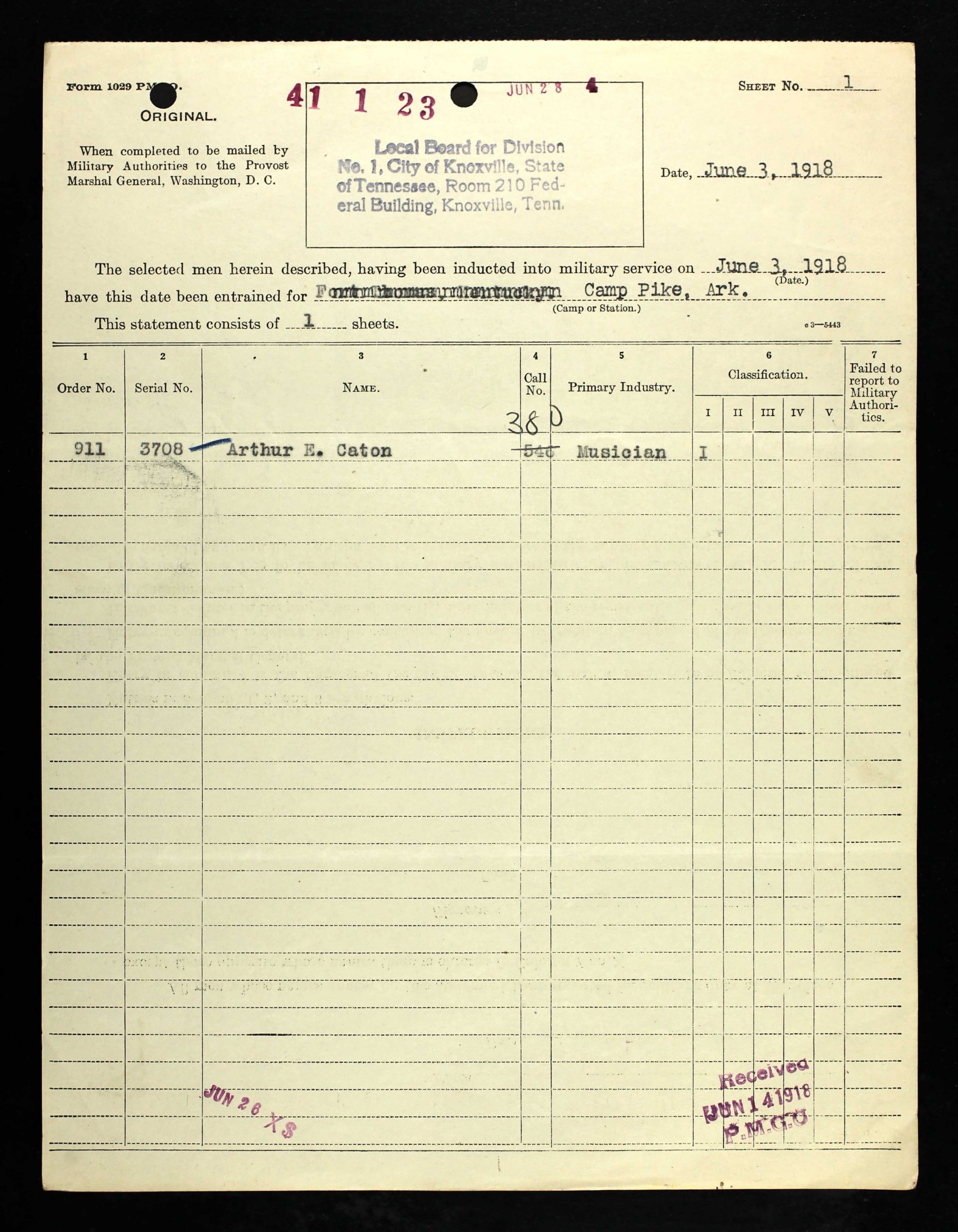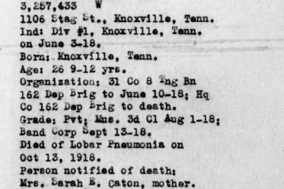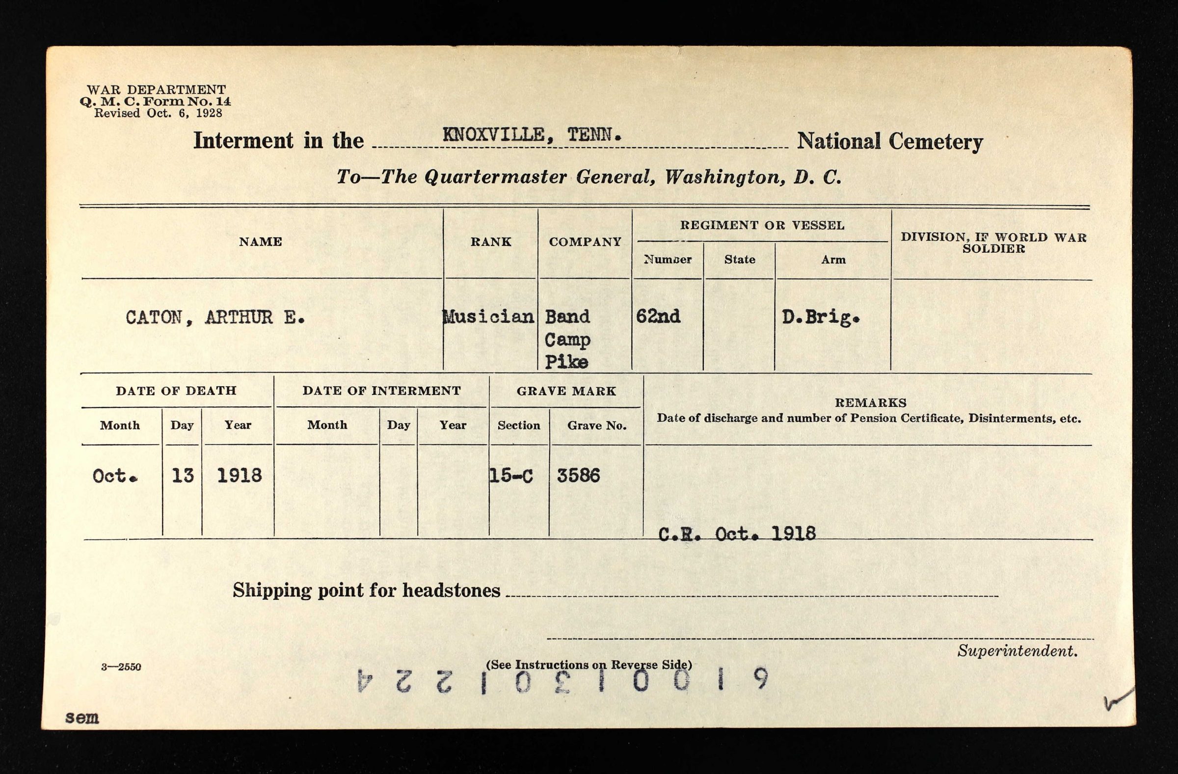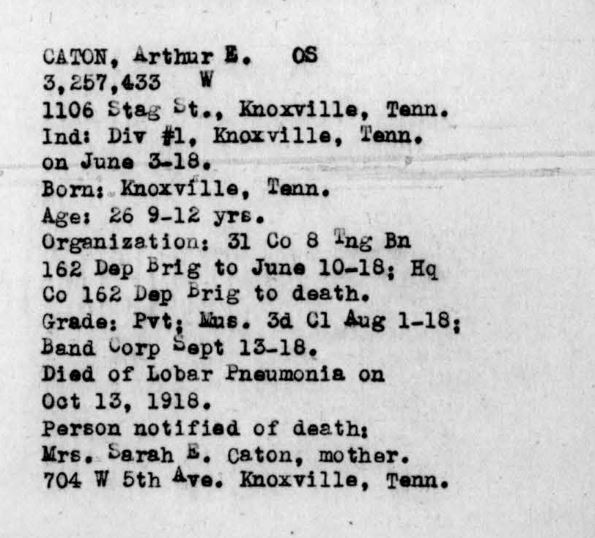 “Arthur E. Caton, aged 27 years, son of Mrs. Sallie Caton, 706 West Fifth avenue, died Sunday at Camp Pike, Little Rock, Arkansas after a short illness of pneumonia. Mr. Caton enlisted in the U.S. Army about five months ago and belonged to the U.S. band. Besides his mother, he is survived by one sister, Mrs. A.W. McNew, of Knoxville, three brothers, Joe, Raymond, and Harmon C. Caton, all of Knoxville. The body is expected to arrive at the funeral parlors of Carl R. Roberts about Friday. Funeral notice will appear later.”