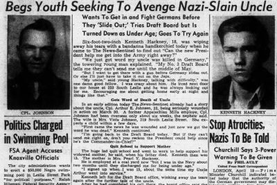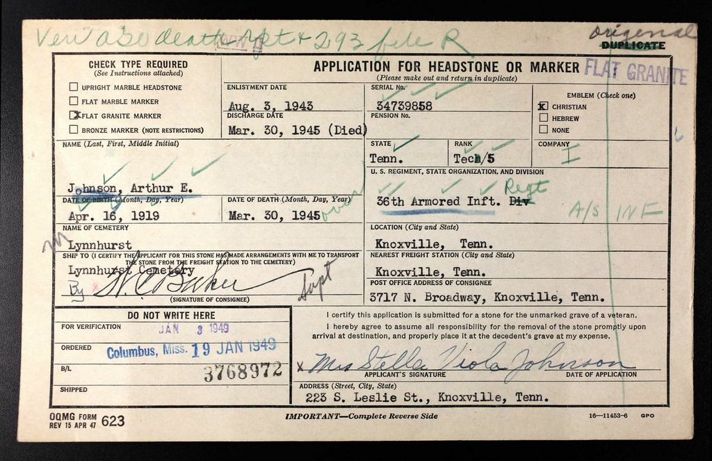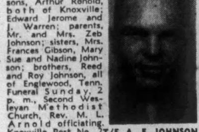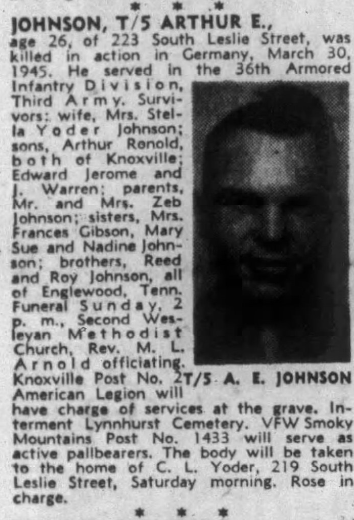 T/5 Arthur E. Johnson, age 26, of 223 South Leslie Street, was killed in action in Germany, March 30, 1945. He served in the 36th Armored Infantry Division, Third Army. Survivors: wife, Mrs. Stella Yoder Johnson; sons, Arthur Ronold, both of Knoxville; Edward Jerome and J. arren; parents, Mr. and Mrs. Zeb Johnson; sisters, Mrs. Frances Gibson, Mary Sue and Nadine Johnson; brothers, Reed and Roy Johnson, all of Englewood, Tenn.