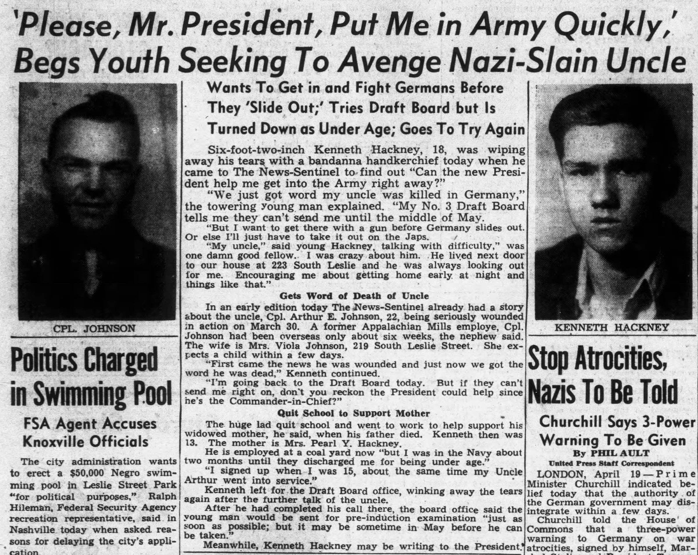 Six-foot-two-inch Kenneth Hackney, 18, was wiping away his tears with a bandanna handkerchief today when he came to The News-Sentinel to find out “Can the new President help me ge tinto the Army right away?” “We just got word my uncle was killed in Germany,” the towering young man explained. “My noc. 3 Draft Board tells me they can’t send me until the middle of May.