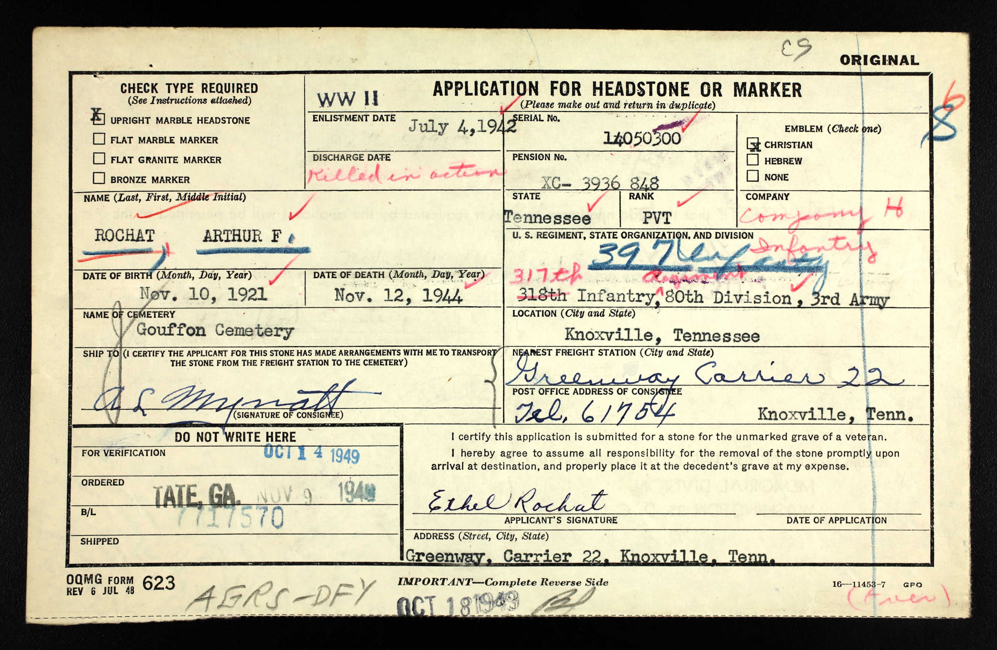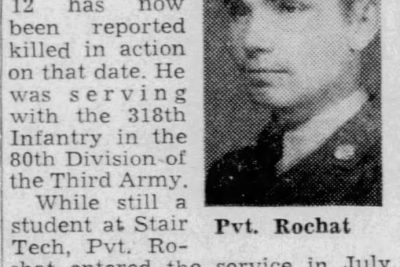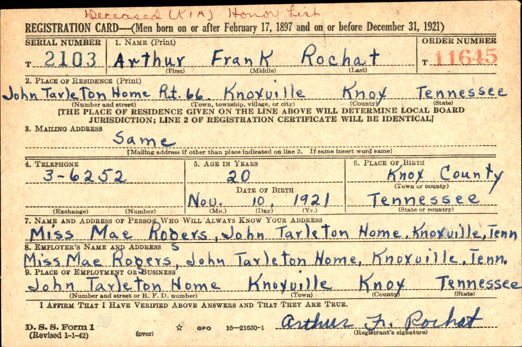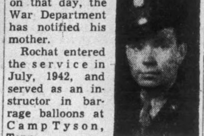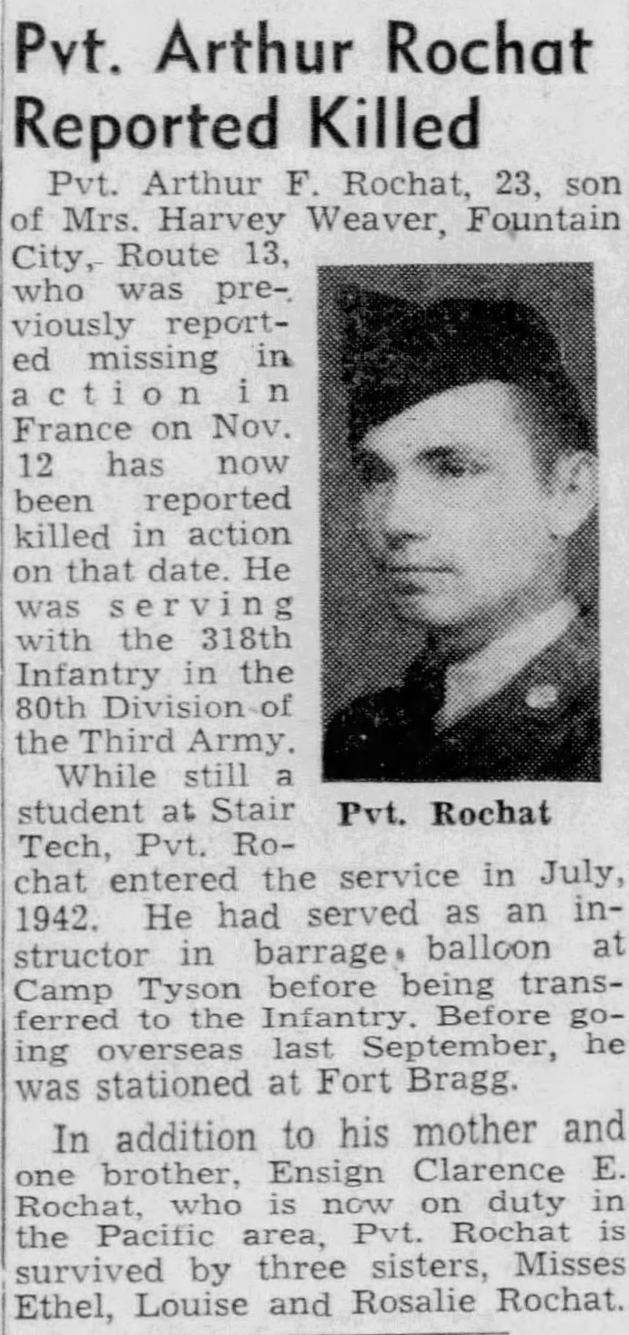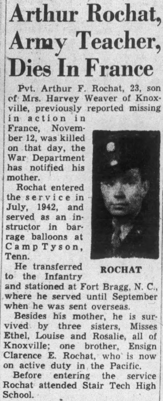 Pvt. Arthur F. Rochat, 23, son of Mrs. Harvey Weaver of Knoxville, previously reported missing in action in France, November 12, was killed on that day, the War Department has notified his mother. Rochat entered the service in July, 1942, and served as an instructor in barrage balloons at Camp Tyson, Tenn. He transferred to the Infantry and stationed at Fort Bragg, N.C. where he served until September when he was sent overseas.