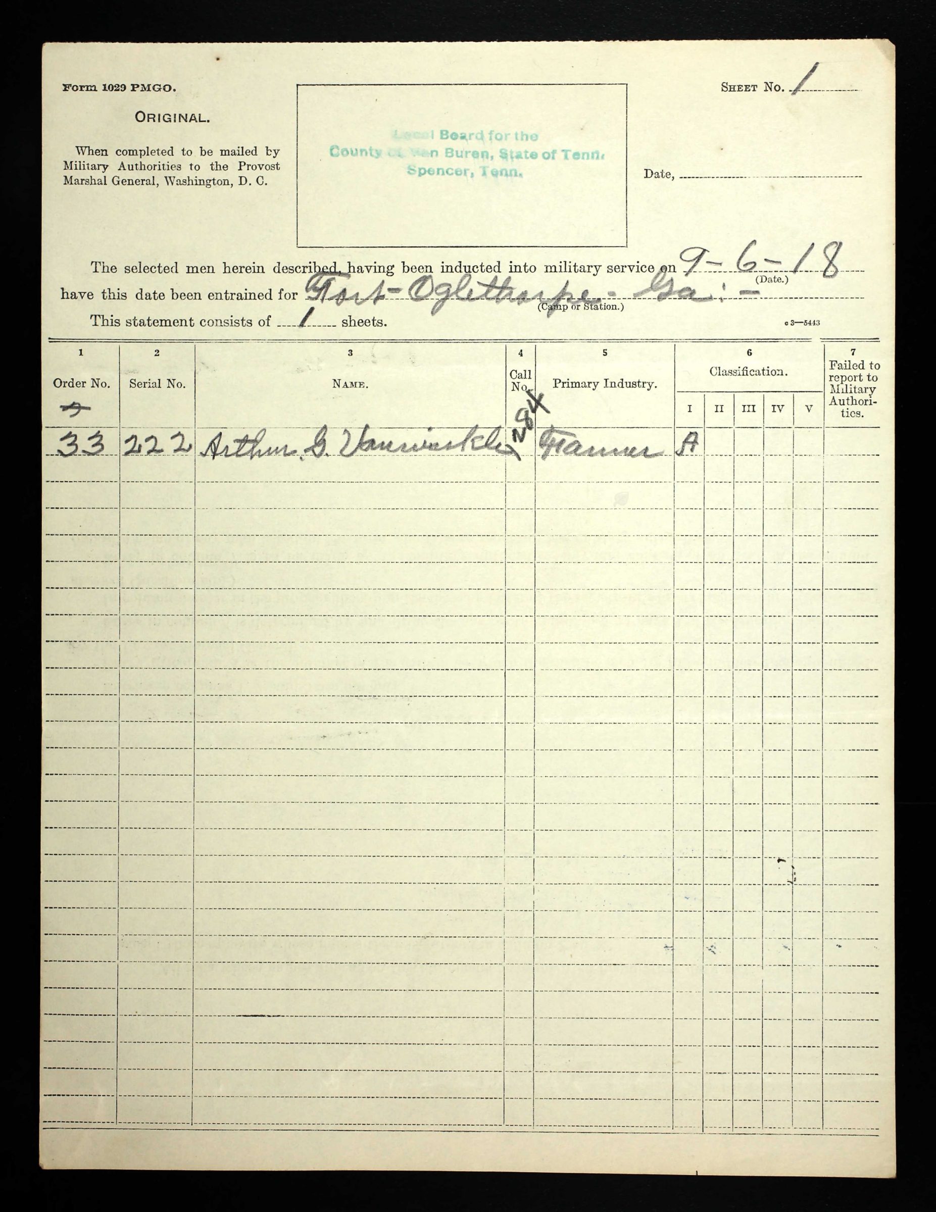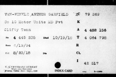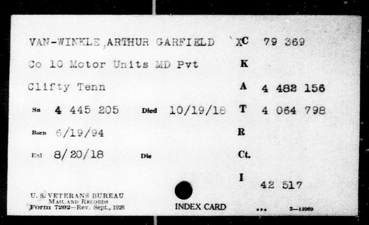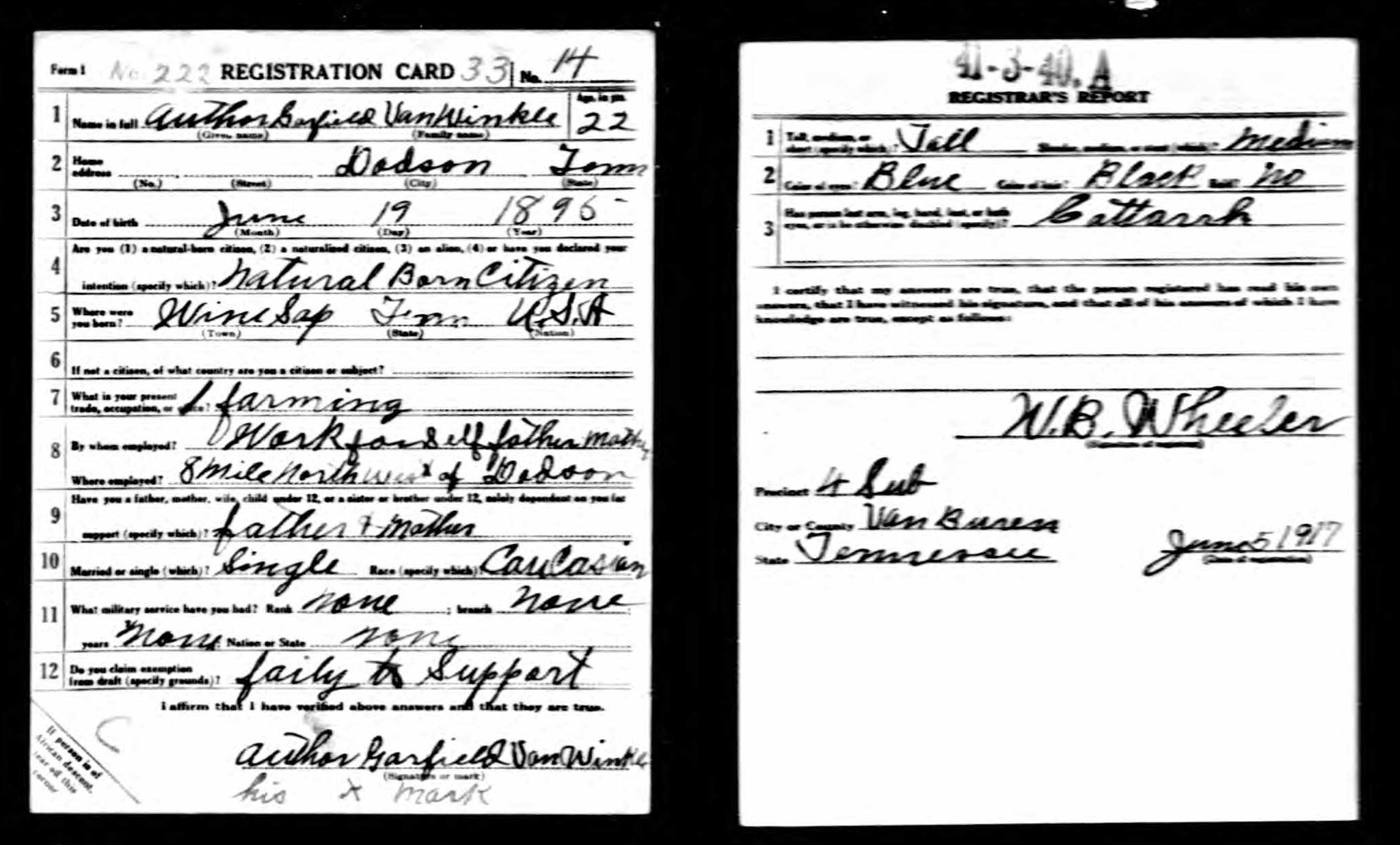 Arthur Garfield Van Winkle was born 19 June 1894, the son of Thomas Reuben Van Winkle and Martha Lou Bryant. He married Mary Jane Evans.