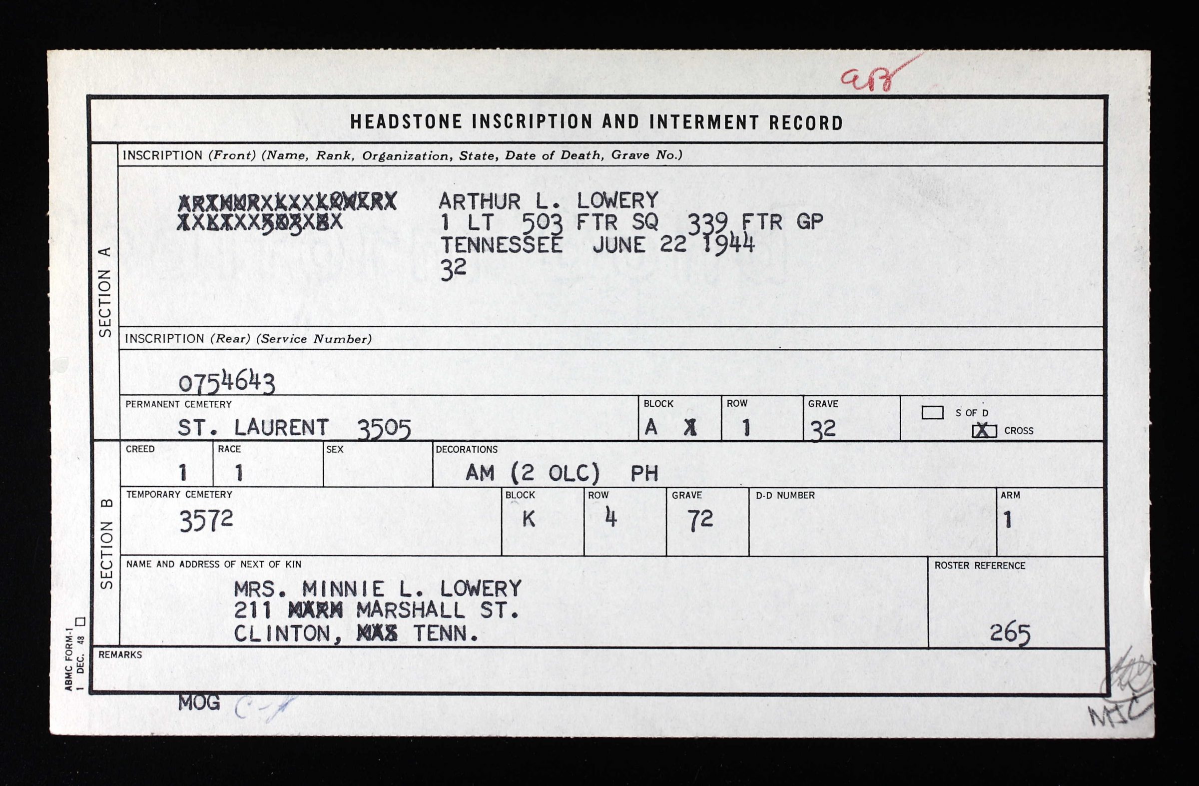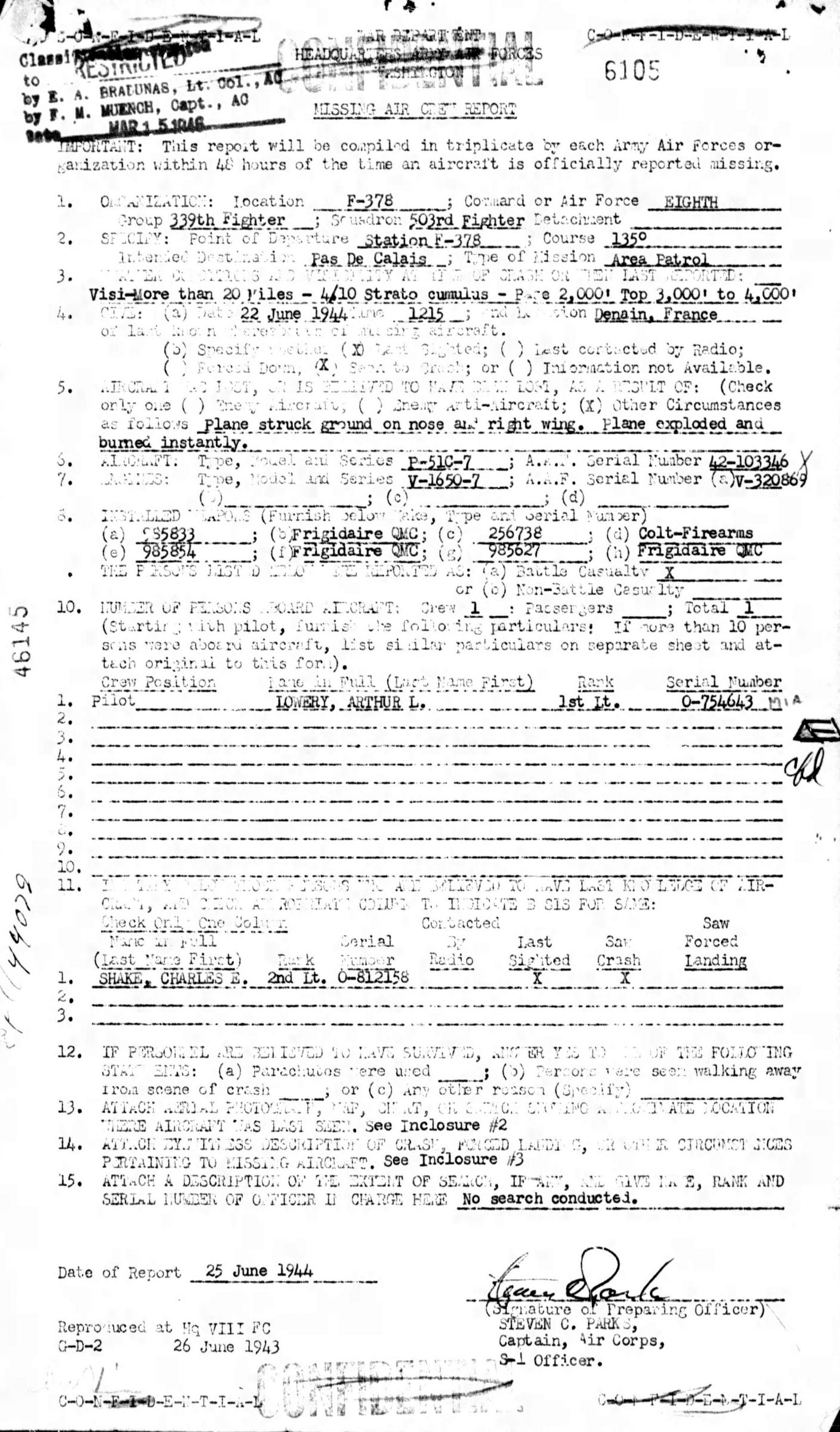 Statement from 2nd Lt Charles E. Shake, Air Corps: “On 22 June, 1944 at approximately 1215 hours, I was flying Lt. Arthur L. Lowery´s wing in Red four position. After we completed sweeping the area we went down to strafe a locomotive. I assumed a position behind and slightly one side of Lt. Lowery. As we went in on the locomotive, I noticed a lot of wire and lines. It is my opinion that he hit some of the wires. I was fairly low to them but he was still lower than I. His airplane rolled very slowly to the right, and when in a position of about 90 degrees bank, it struck the ground on the nose and right wing. The plane exploded and burned instantly.”