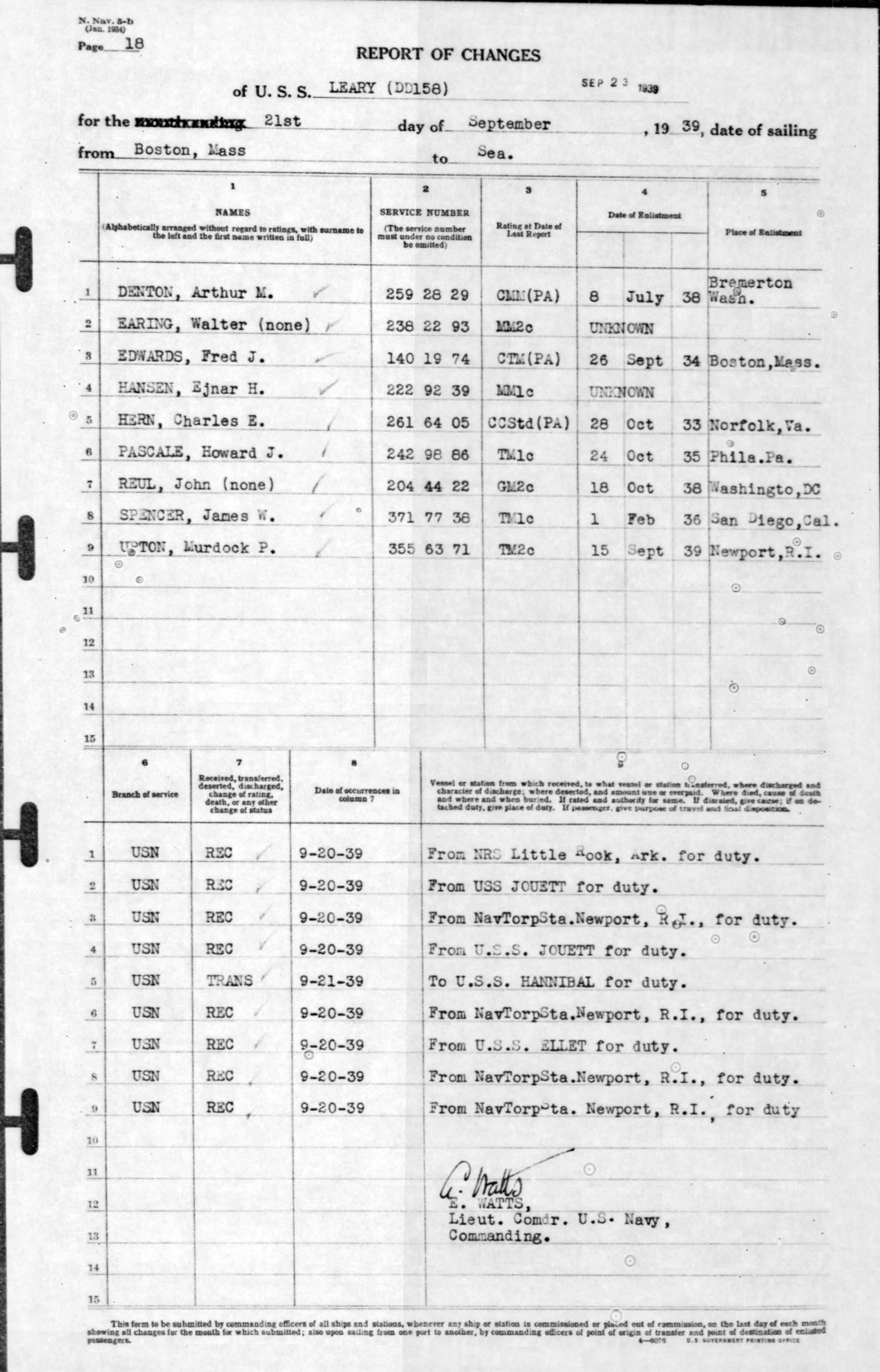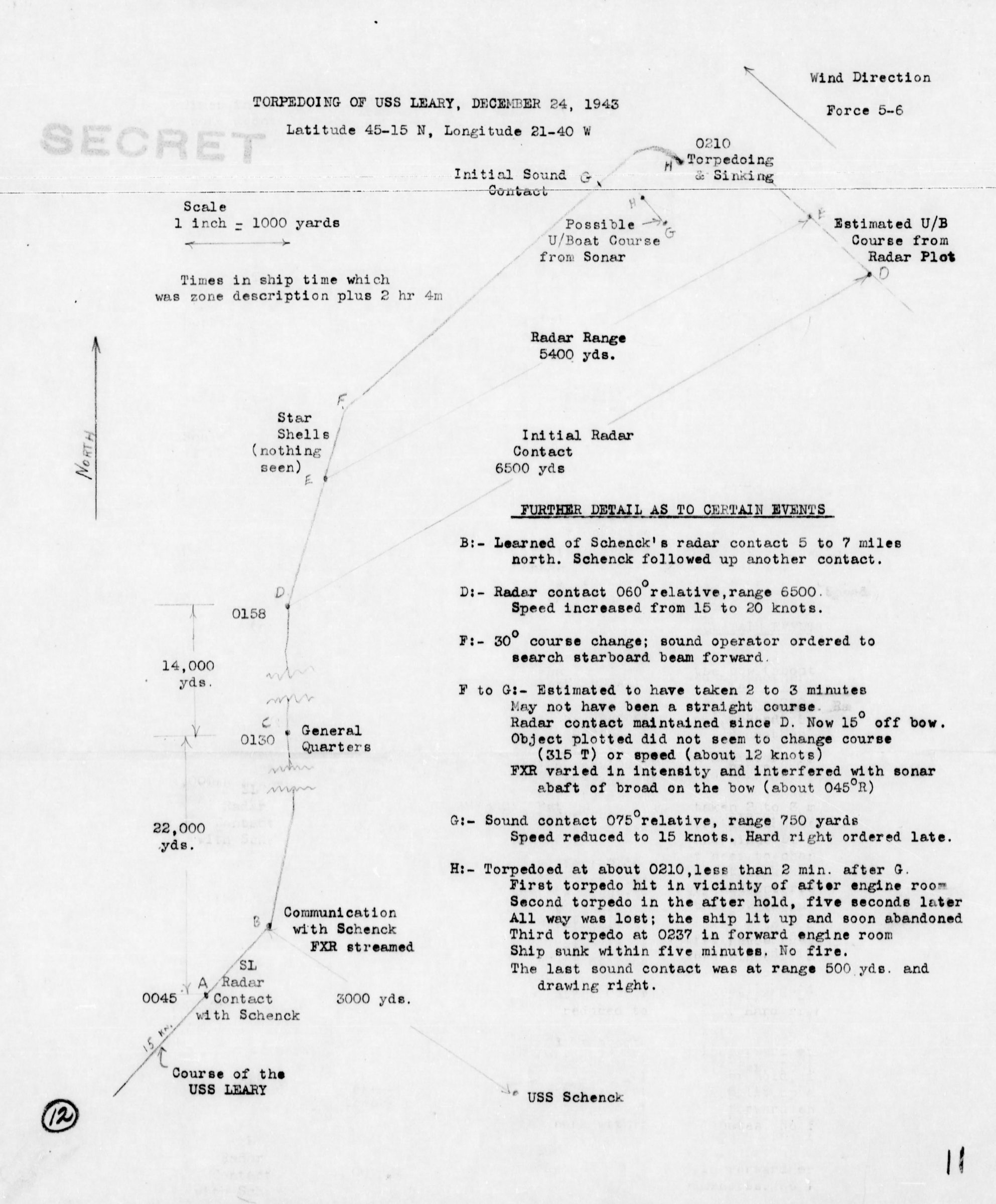 The Leary was hit aft on the starboard side by two torpedoes within the space of not more than five seconds. It isestimated that the first torpedo struck in the vicinity of the after engine room, rupturing the main, as well as auxiliary steam lines. The after engine room flooded instantly and all men in this space were lost.