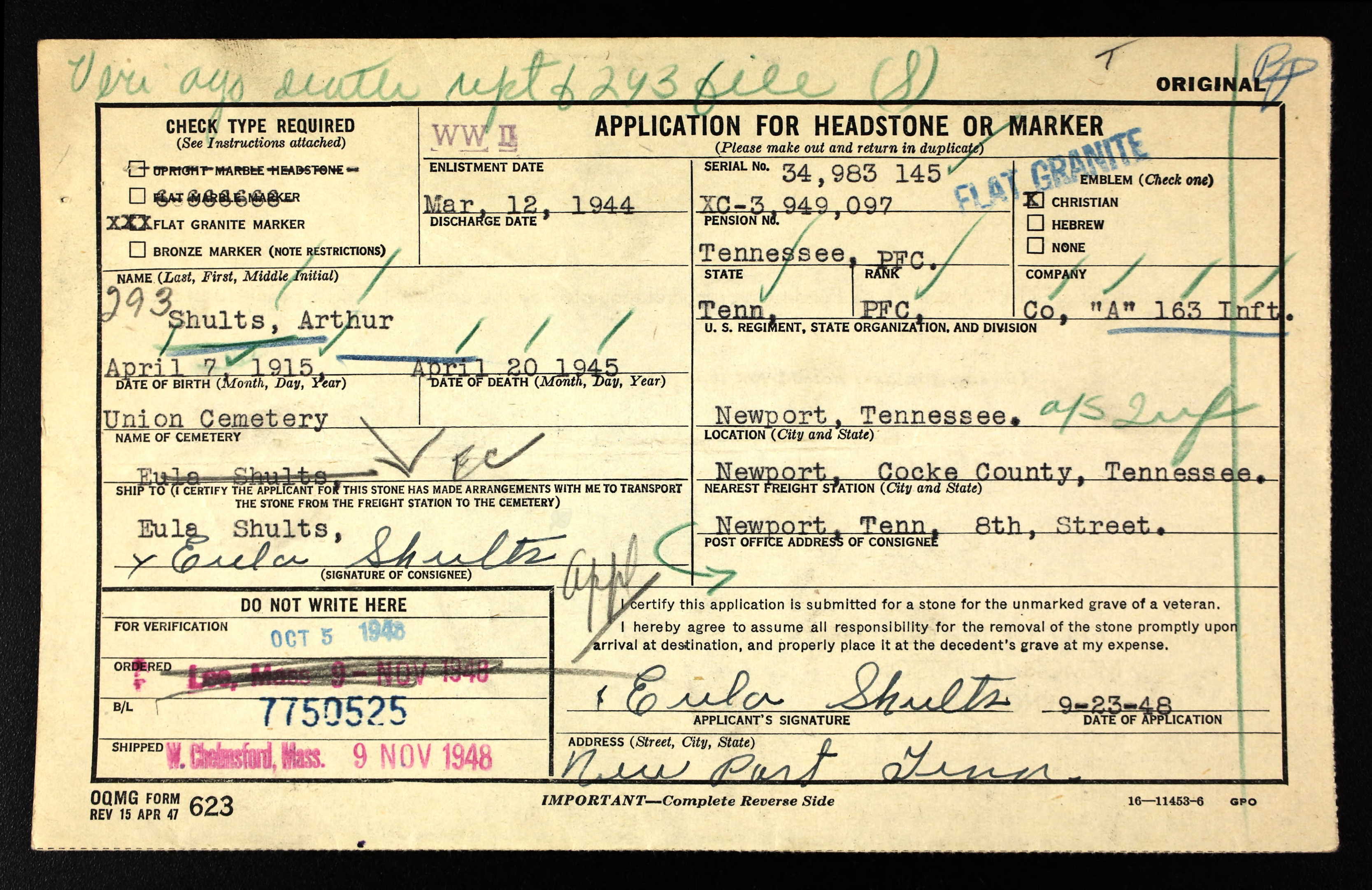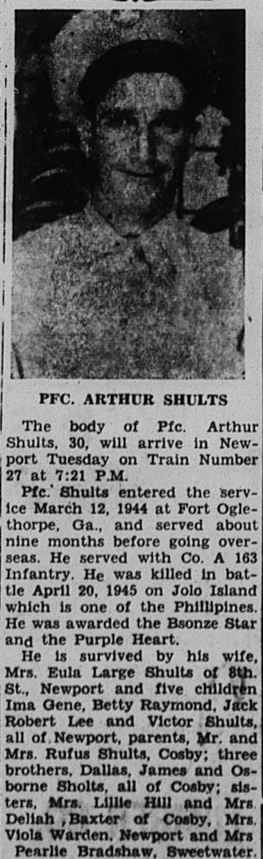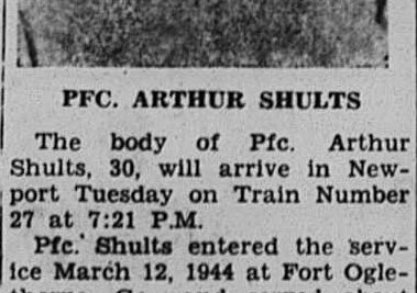 The body of Pfc. Arthur Shults, 30 will arrive in Newport Tuesday on Train Number 7 at 7:21 P.M. Pfc. Shults entered the service March 12, 1944 at Fort Oglethorpe, Ga., and served about nine months before going overseas. He served with Co. A 163 Infantry. He was killed in battle April20, 1945 on Jolo Island which is one of the Philippines. He was awarded the Bronze Star and the Purple Heart.