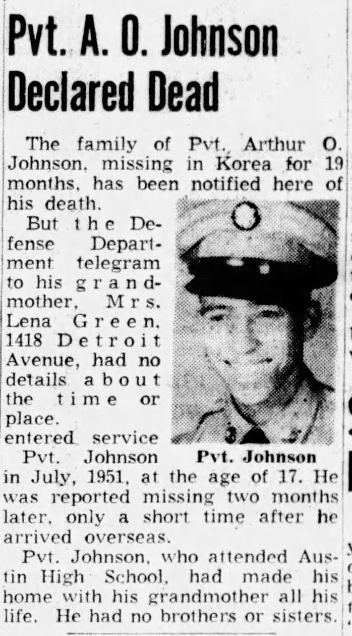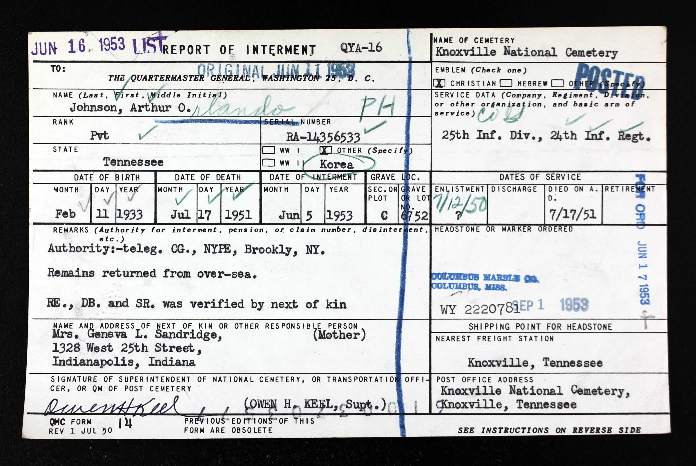 He was repatriated back to Knoxville and funeral services were held on June 5, 1953, at the chapel of Lillison and Mills Funeral Home. Private Johnson was interred in the US National Cemetery in Knoxville.