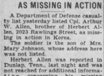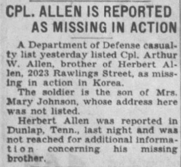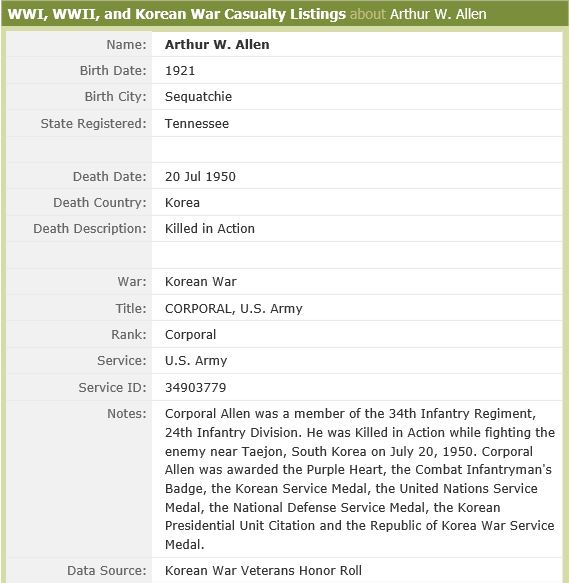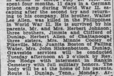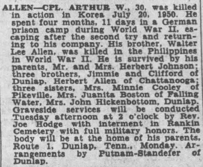Cpl. Arthur W. Allen, 30, was killed in action in Korea July 20, 1950. He spent four months, 11 days in a German prison camp during World War II, escaping after the second try and returning to his company. His brother, Private Walter Lee Allen, was killed in the Philippines in World War II. He is survived by his parents, Mr. and Mrs. Herbert Johnson; three brothers, Jimmie and Clifford of Dunlap, Herbert Allen of Chattanooga; three sisters, Mrs. Minnie Cooley of Pikeville, Mrs. Juanita Boston of Falling Water, Mrs. John Hickenbottom, Dunlap.