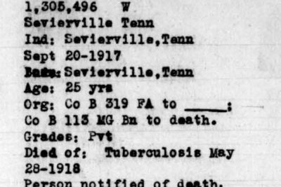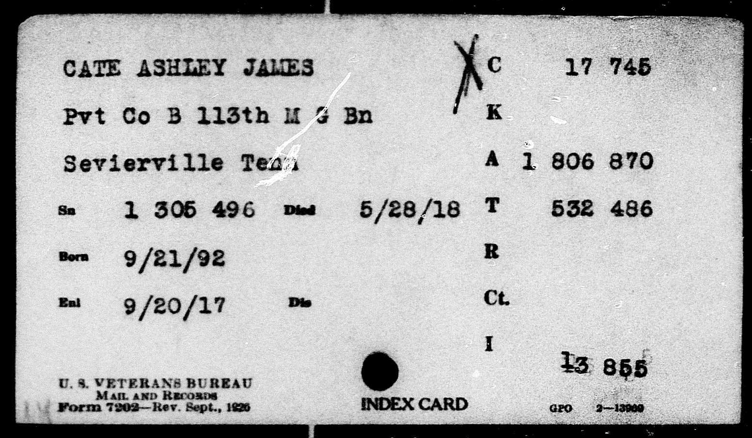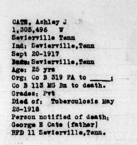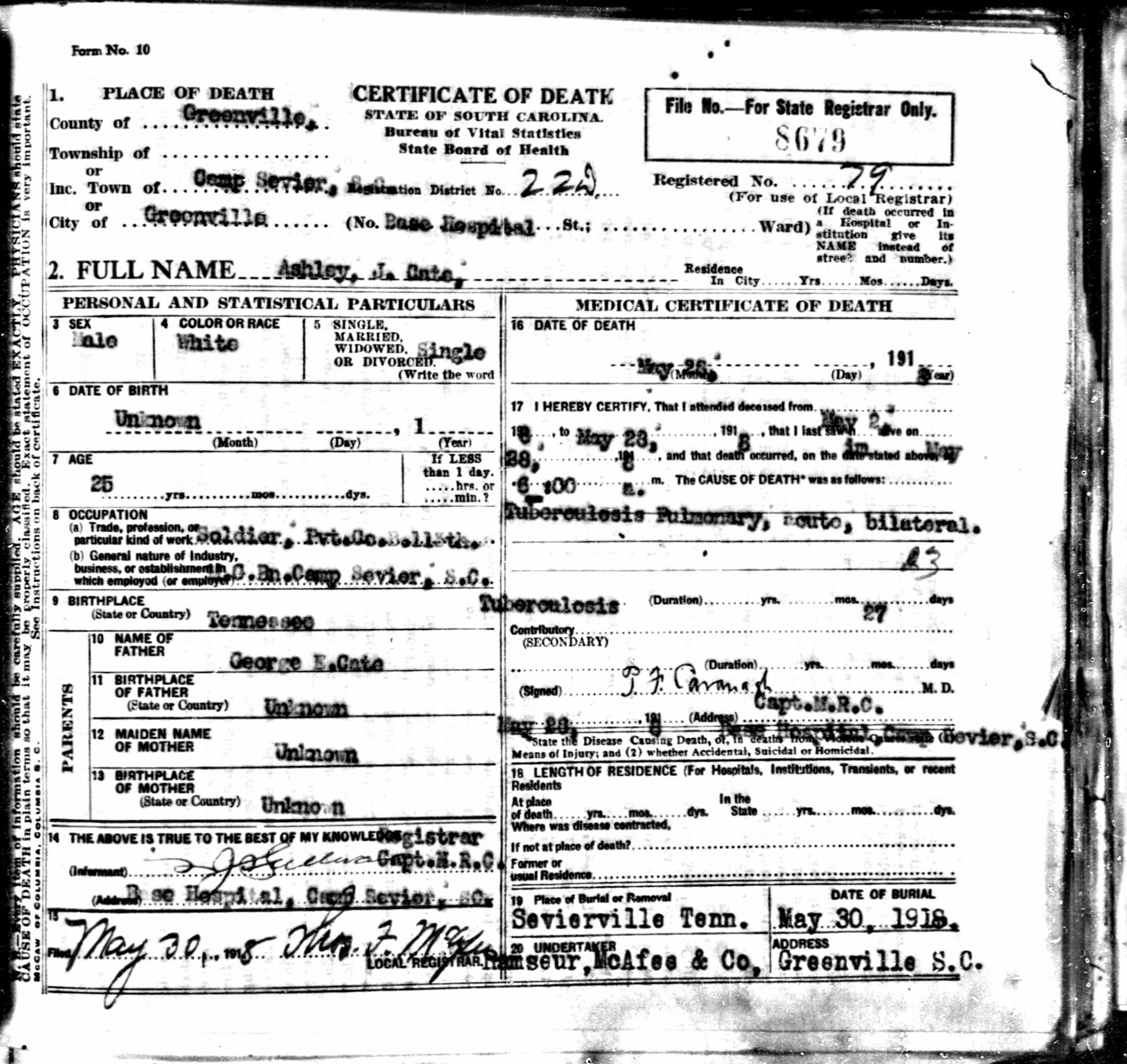 Private Cate died at Camp Sevier, Greenville, SC, Base Hospital, of Tuberculosis Pulmonary.