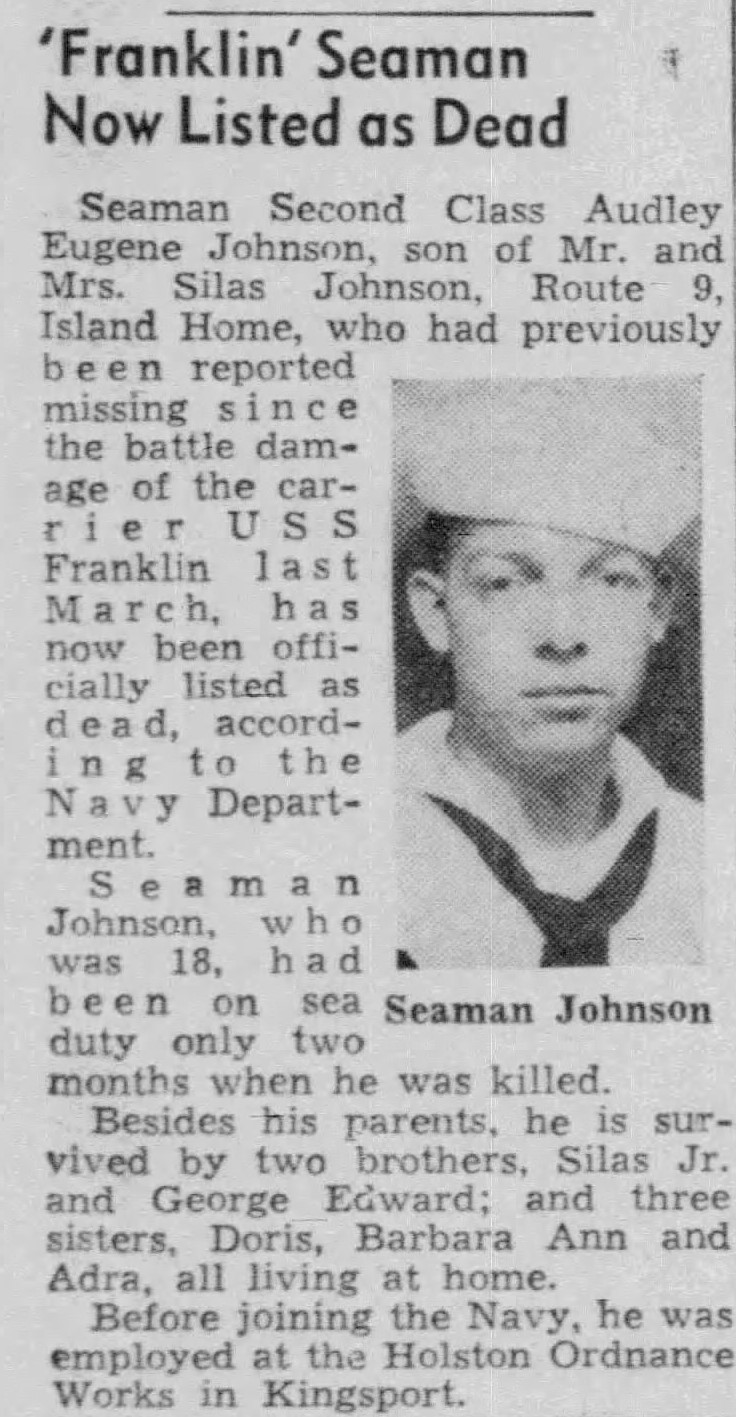 Seaman Second Class Audley Johnson, 18-year-old gunner, has been reported misisng following naval battle action in the South Pacific, the Navy Department yesterday notified his parents, Mr. and Mrs. Silas Johnson, Route nine. Seaman Johnson, overseas since January, entered the Navy last October. He attended Anderson School and formerly was employed as a tool clerk by a Kingsport engineering firm.