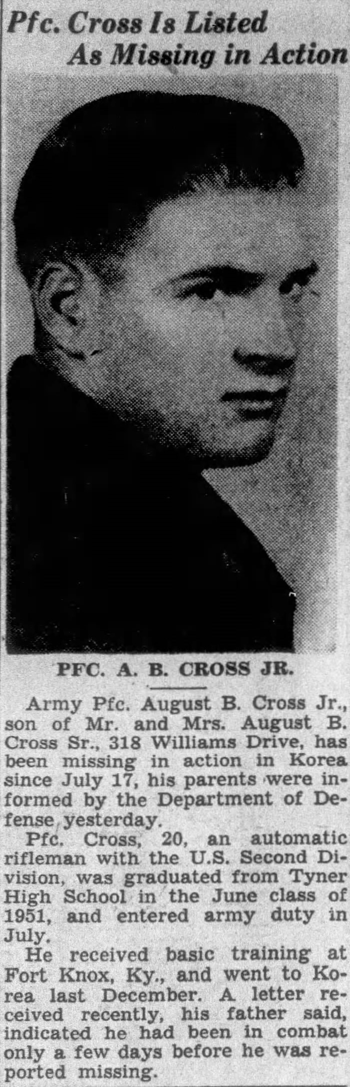 Army Pfc. August B. Cross Jr., son of Mr. and Mrs. August B. Cross Sr., 318 Williams Drive, has been missing in action in Korea since July 17, his parents were informed by the Department of Defense yesterday. Pfc. Cross, 20, and automatic rifleman with the U.S. Second Division, was graduated from Tyner High School in the June class of 1951, and entered army duty in July. He received basic training at Fort Knox, Ky., and went to Korea last December. A letter received recently, his father said, indicated he had been in combat only a few days before he was reported missing.