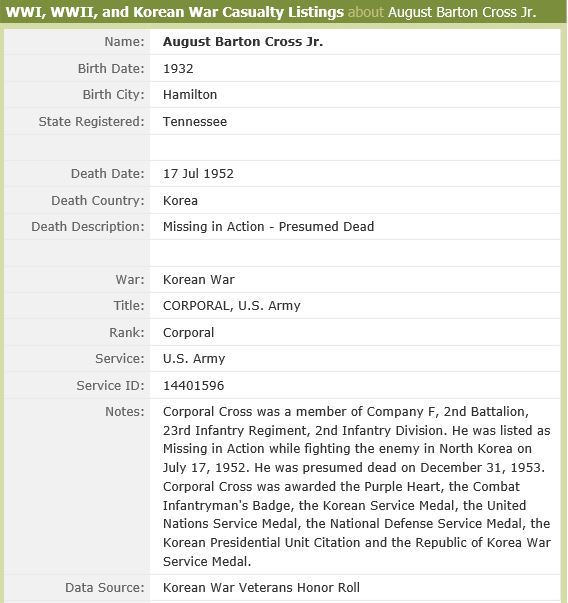 Corporal Cross was a member of Company F, 2nd Battalion, 23rd Infantry Regiment, 2nd Infantry Division. He was killed in action while fighting the enemy in Korea. He was listed as missing in action while fighting the enemy in North Korea on July 17, 1952. He was presumed dead on December 31, 1953. His name is inscribed on the Courts of the Missing at the Honolulu Memorial.