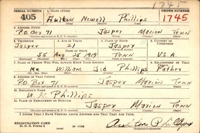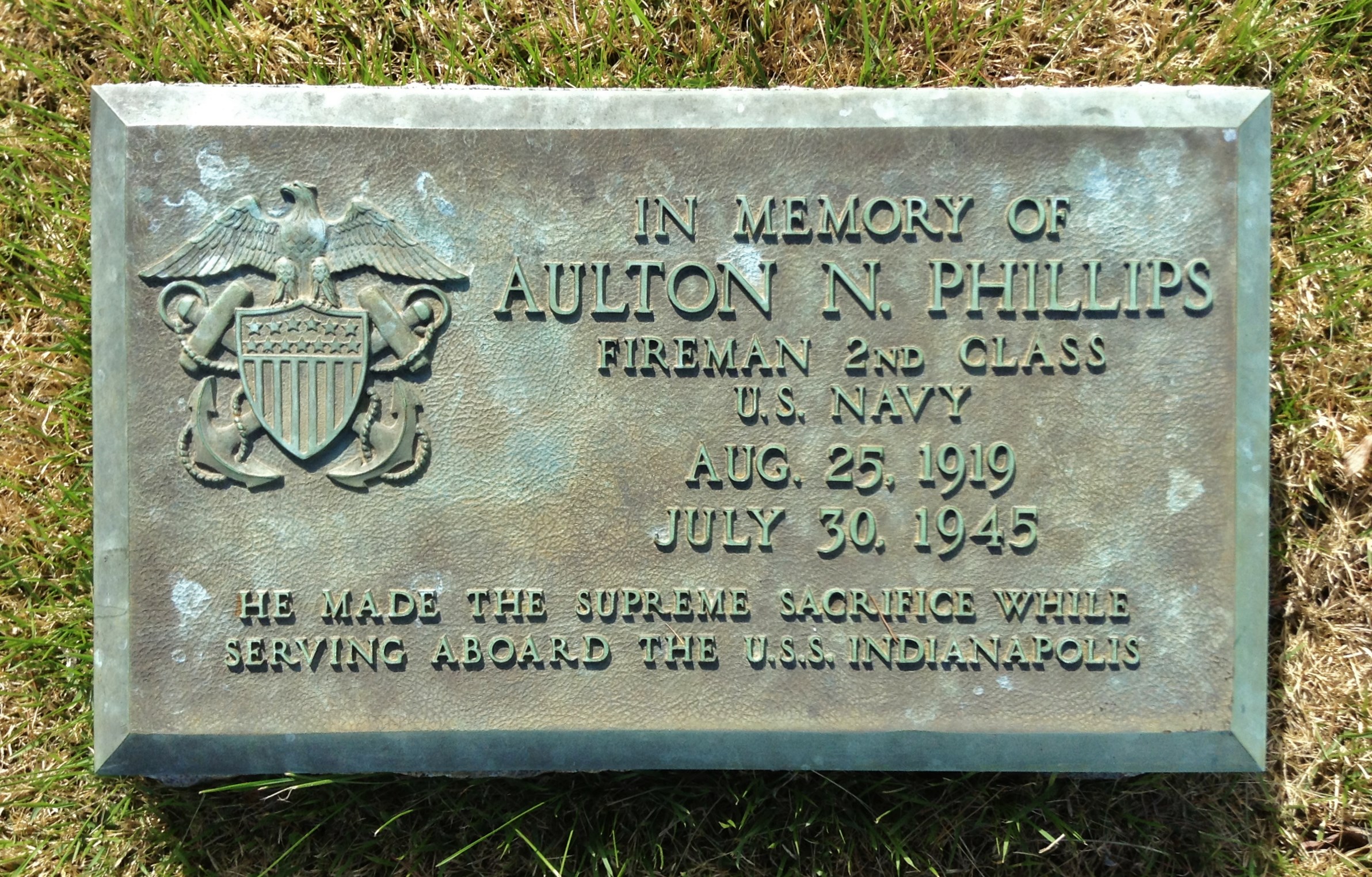 Aulton Phillips served as a Fireman 2nd Class aboard the cruiser U.S.S. Indianapolis (CA-35). After delivering the components for the atomic bomb to Tinian Island, his ship was torpedoed and sunk July 30, 1945. He was lost at sea along with 879 fellow crewman.