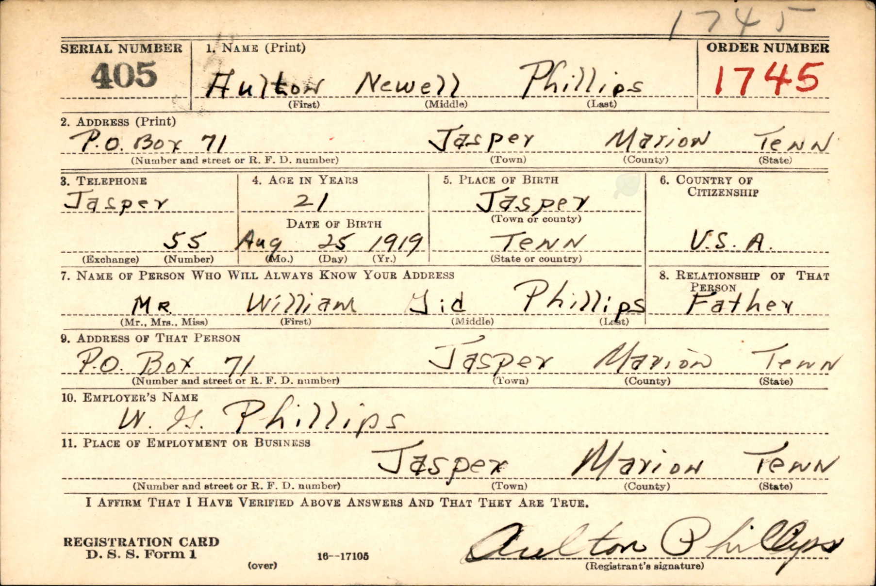 Aulton Newell Phillips Sr. was born on 25 August 1919, the son of William Gideon (Gid) Phillips and Mary Ann Long. He was married to Aileen Evelyn Harris and father of Aulton Newell Phillips Jr.