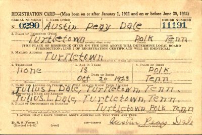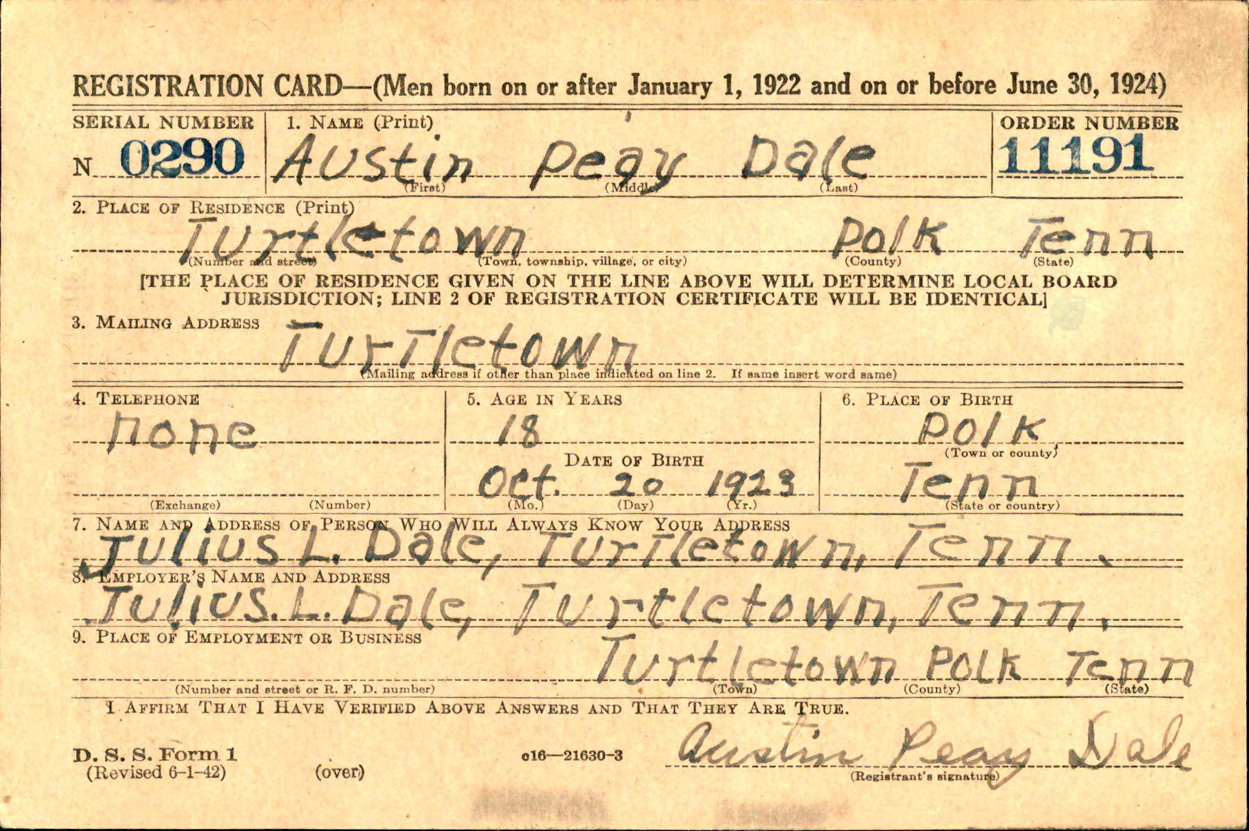 Austin Peay Dale was the youngest son of Julius Lafayette Dale and Molly Tilley of Turtletown, Polk County, Tennessee. His siblings included Elda, Willie, Bertus, Mamie, Ester, Goldie, and Sammie Dale.
