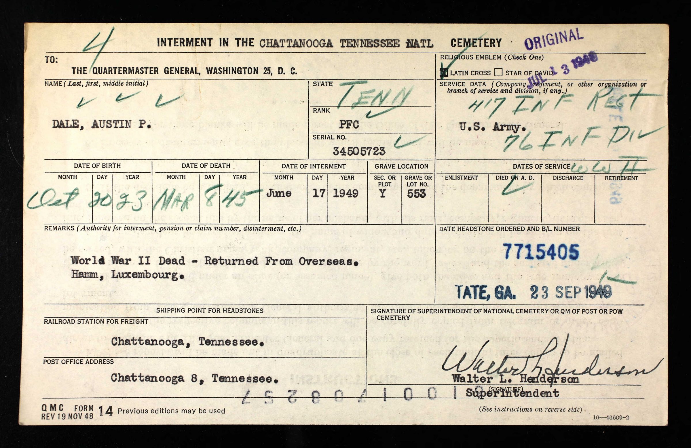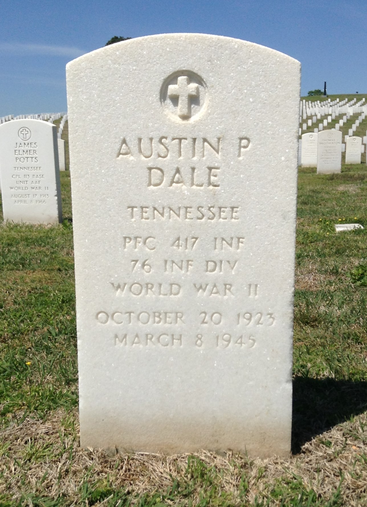 Austin enlisted in the US Army on January 14, 1943 at Fort Oglethorpe, Georgia and was assigned to the 417 Infantry Regiment, 76th Infantry Division. He was promoted to the rank of Private First Class. Austin was killed in action on March 8, 1945 and was repatriated back to Tennessee after the war. Private First Class Dale was buried June 17, 1949 at Chattanooga National Cemetery, Chattanooga, Tennessee