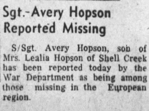 Avery Hopson was born on 4 August 1917, the son of Charles Carry Hopson and Leila Scoggins. Brother of Staff Sergeant Frank Hopson who was killed in the South Pacific area in 1943. Mr. and Mrs. Hopson had five sons in the army.