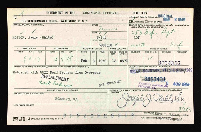 Staff Sergeant Hopson served with the 253rd Infantry Regiment and was killed in Action 7 April 1945 in the European Theatre of war.