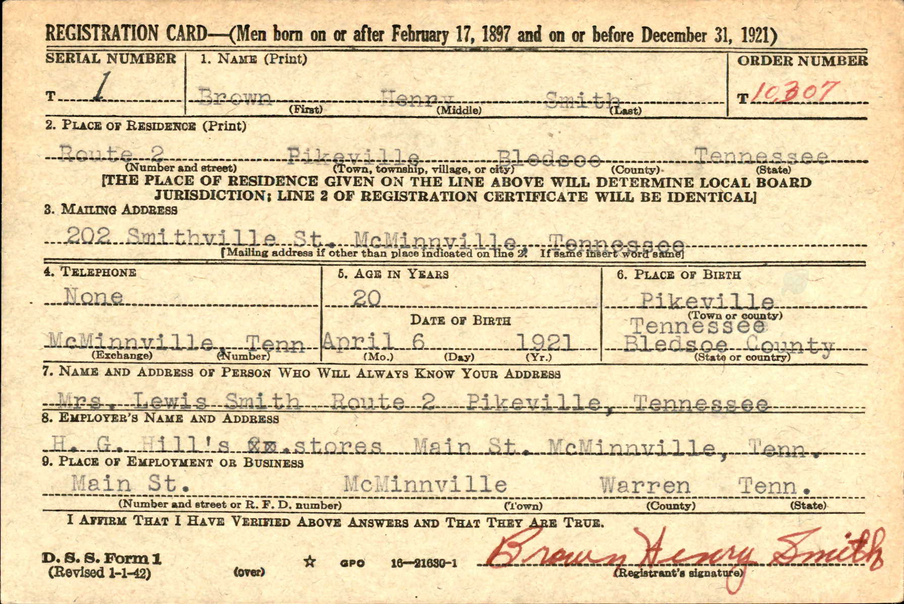 Brown Henry Smith was born on 6 April 1921 in Pikeville, Tennessee. He was the son of Lewis Benjamin Smith and Nancy Jane Douglas Reel Smith.