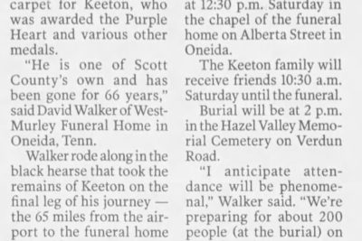 Walker rode along in the black hearse that took the remains of Keeton on the final leg of his journey — the 65 miles from the airport to the funeral home in Oneida.