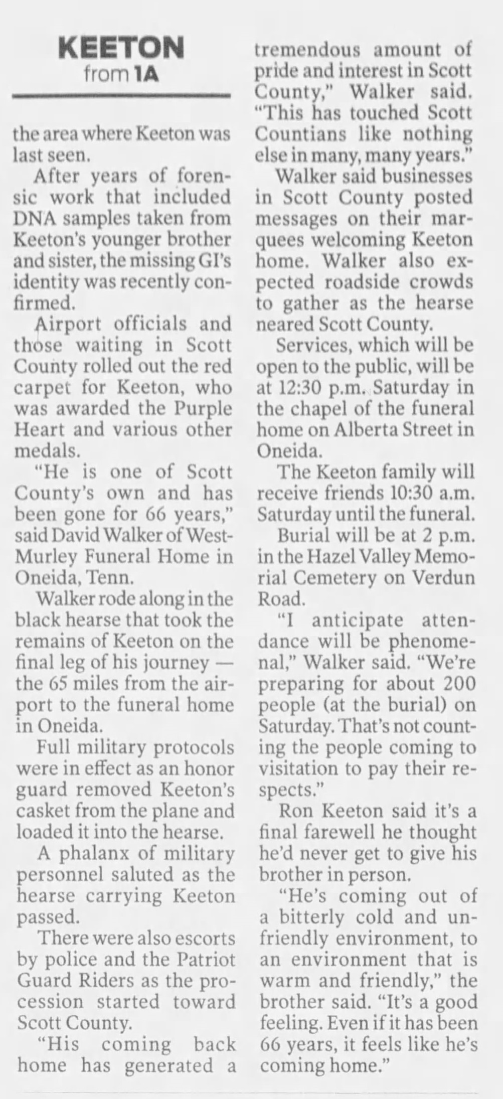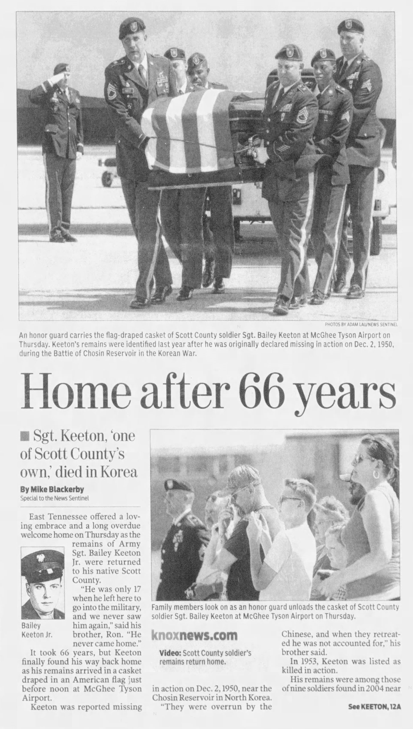 It took 66 years, but Keeton finally found his way back home as his remains arrived in a casket draped in an American flag just before noon at McGhee Tyson Airport.