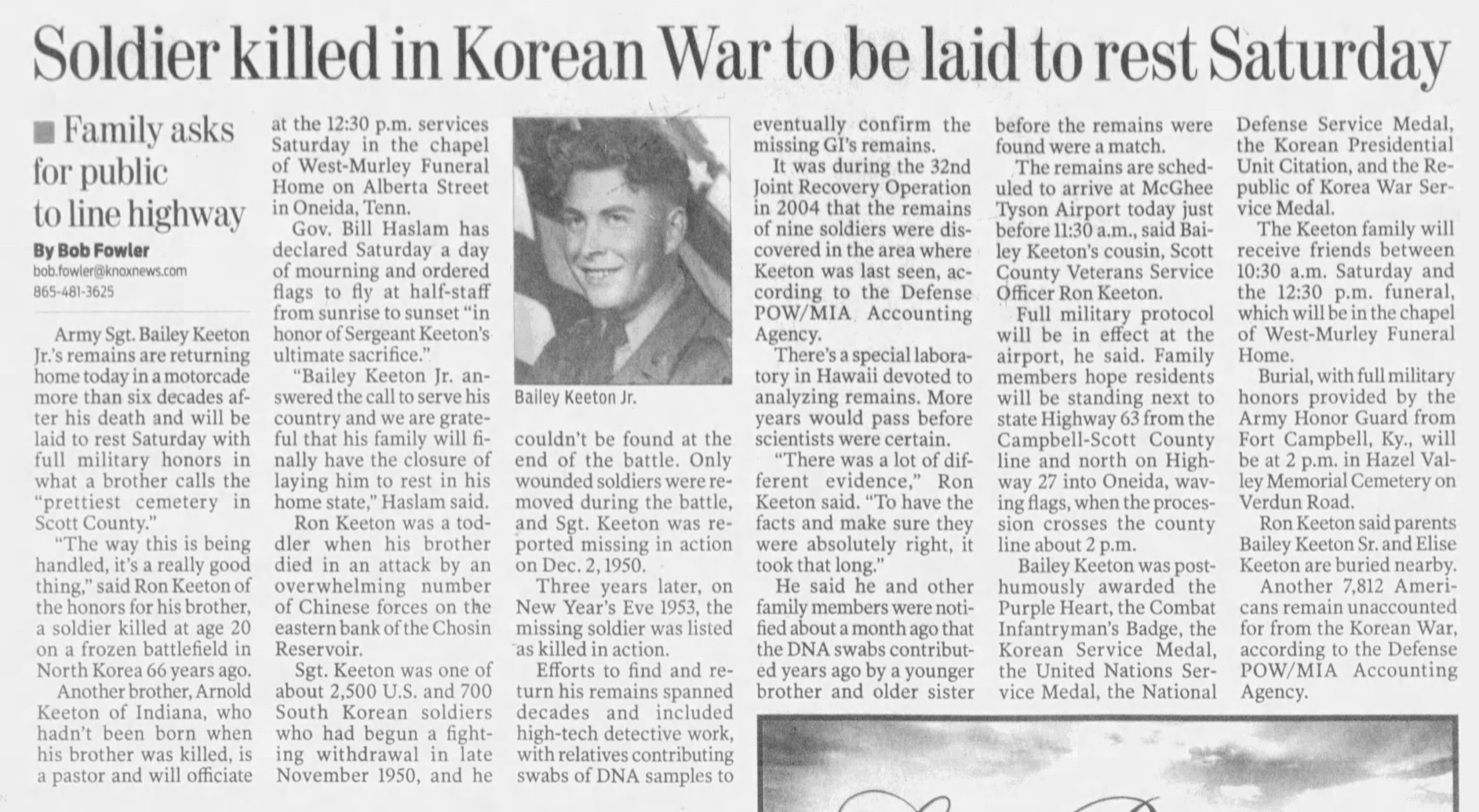 Keeton was reported missing in action on Dec. 2, 1950, near the Chosin Reservoir in North Korea. “They were overrun by the Chinese, and when they retreated he was not accounted for,” his brother said. In 1953, Keeton was listed as killed in action. His remains were among those of nine soldiers found in 2004.