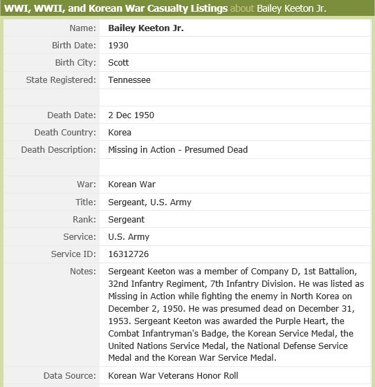 Sergeant Keeton was a member of Company D, 1st Battalion, 32nd Infantry Regiment, 7th Infantry Division. He was listed as Missing in Action while fighting the enemy in North Korea on December 2, 1950. He was presumed dead on December 31, 1953. His remains were not recovered. His name is inscribed on the Courts of the Missing at the Honolulu Memorial.
