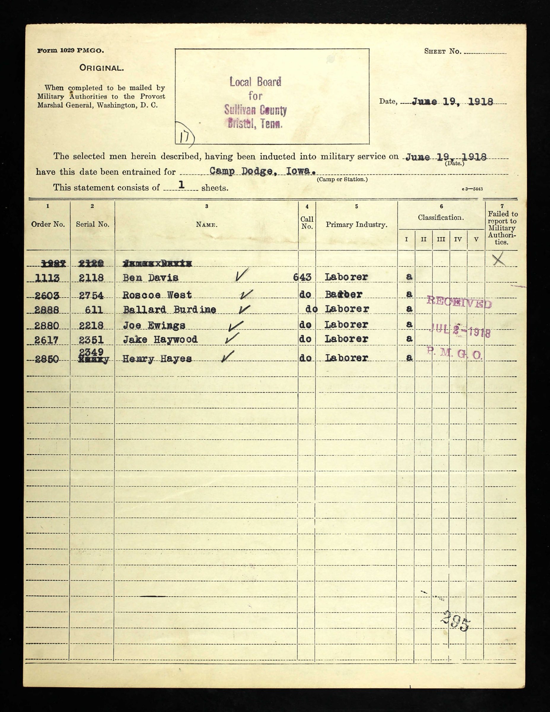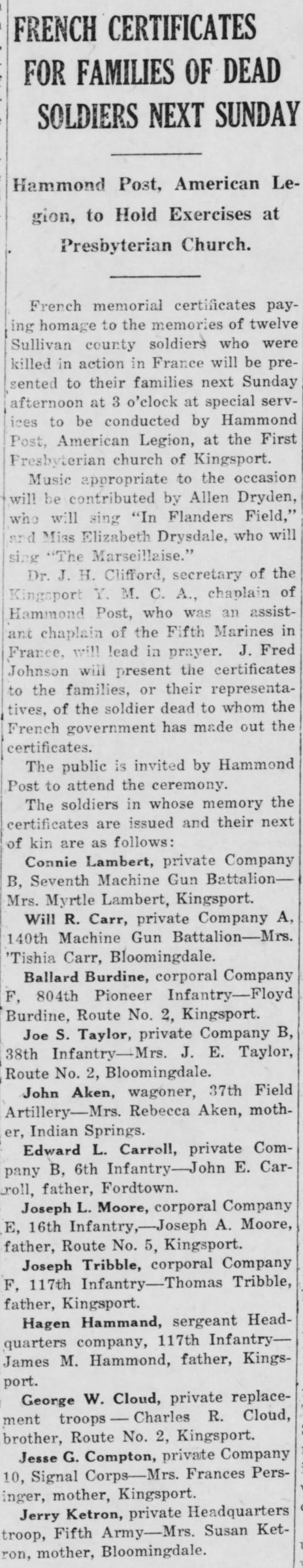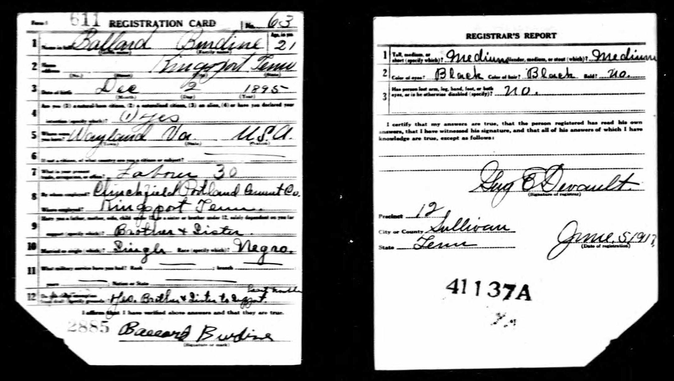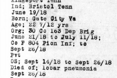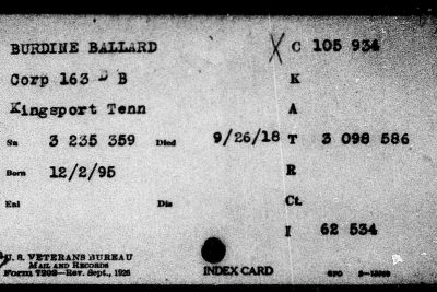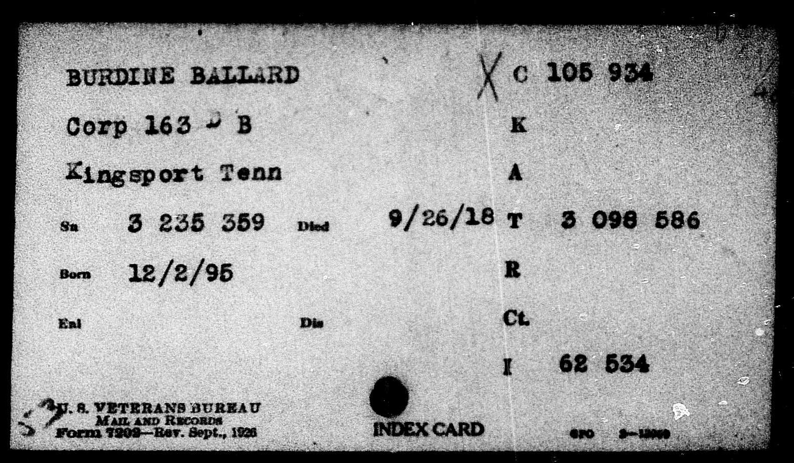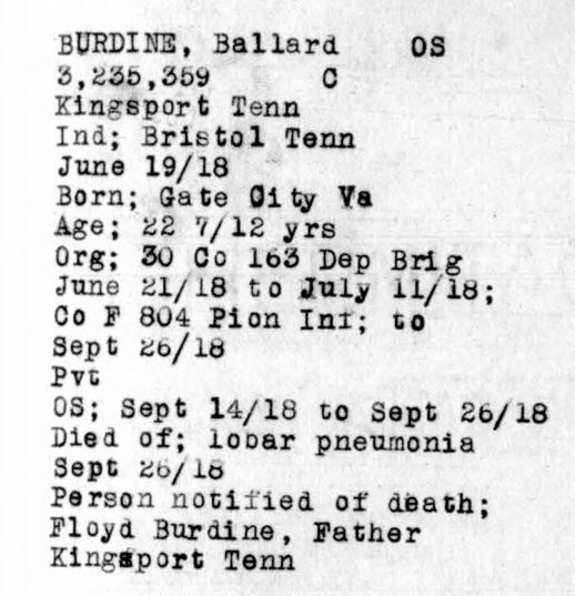 Ballard Burdine was born in Gate City, Virginia. Son of Floyd Burdine and Lucy A. Strong, Route no. 2, Kingsport. He died in France of lobar pneumonia.
