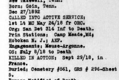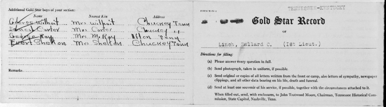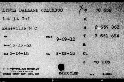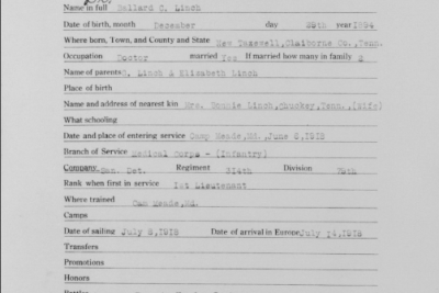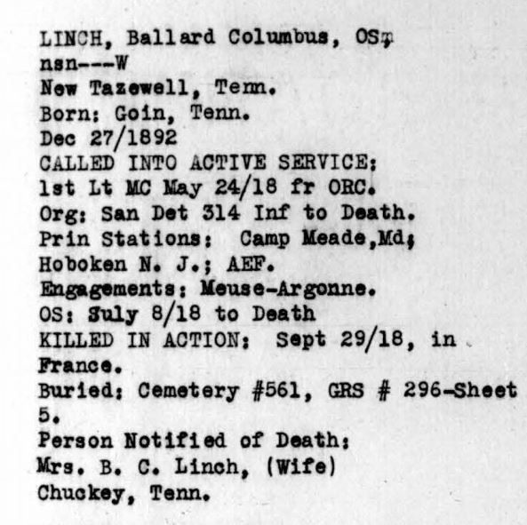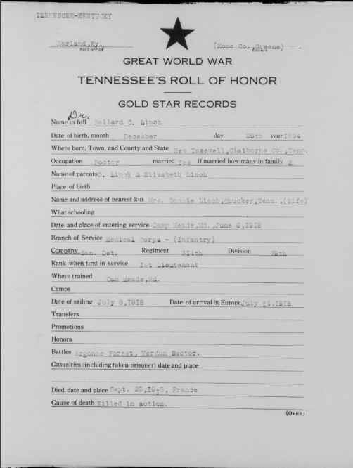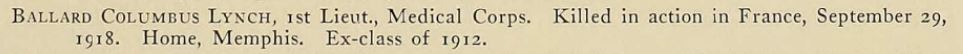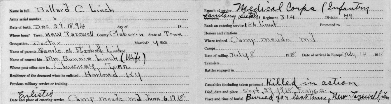 Lieut. Lynch, who was 26 years old, was born at New Tazwell, Tenn. He was a student at the University of Tennessee, and was graduated from the Louisville Medical College, Kentucky, June 6, 1917. He received his commission April 25, 1918, and was assigned to duty at Camp Meade, Md. He sailed for France August 1. He was senior surgeon of the third battalion of the 314th Infantry.