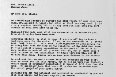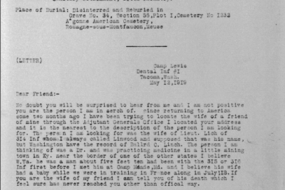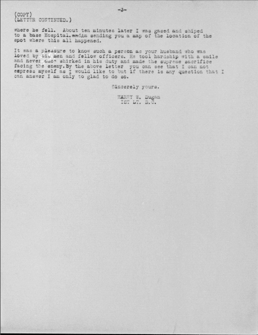 It is always a very painful duty to inform anyone of a death, but when you know that your husband gave his life for a great cause and that no better medical officer lived, you will find some comfort. He was killed with many others. I extend to you my personal sympathy and the sympathy of all the sympathy of all that are left of this detachment. Sincerely yours, L.H. Martin, Captain.