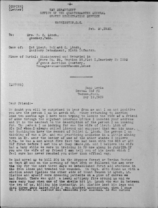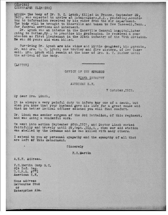 The following letter was received by Mrs. Lynch from Capt. L.H. Martin Office of the Surgeon 314th Infantry.