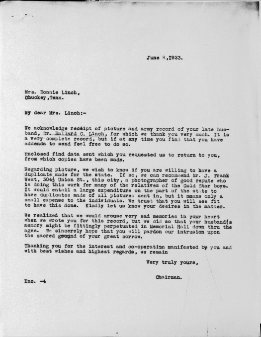 Dr. Ballard Columbus Lynch, also spelled Linch in State records, was born in 1892 in Goin, Tennessee.