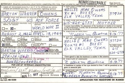 Barton Warren Owens was born on 2 August 1922 in Stanfill, Campbell County, Tennessee. Son of George Sherman Owens and Nellie Mae Smith of Elk Valley, Tennessee