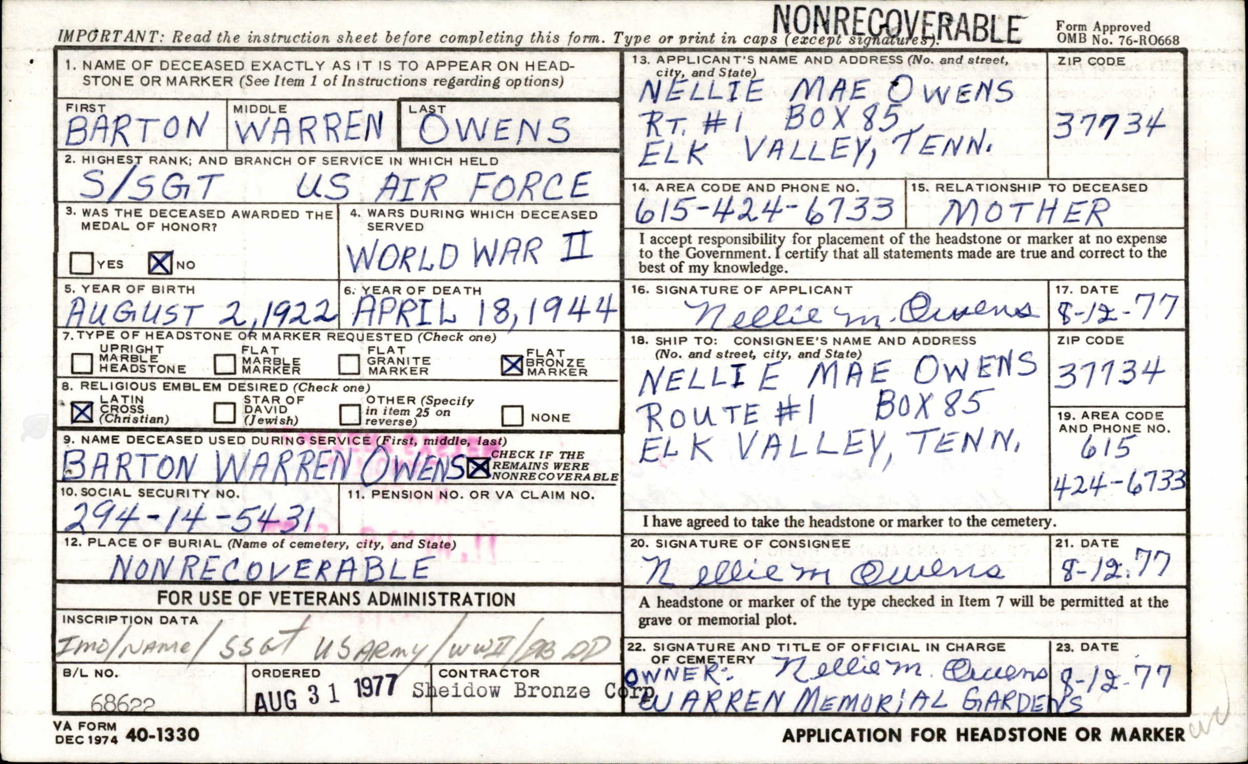 S/Sgt. Barton W Owens, Asst Flight Engineer, from Elk Valley TN, MIA-KIA