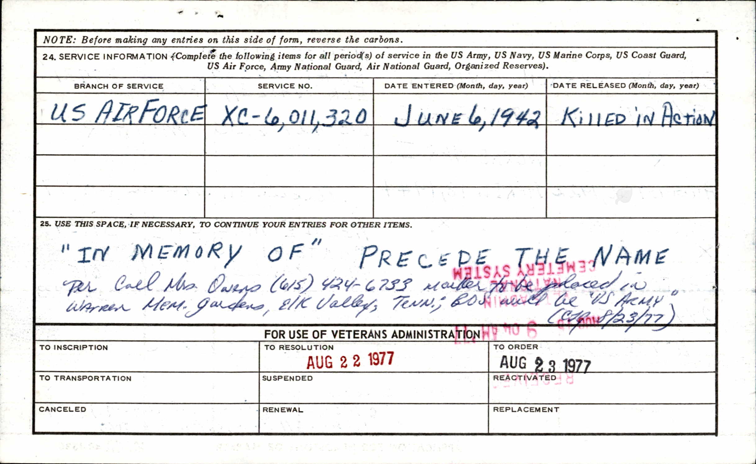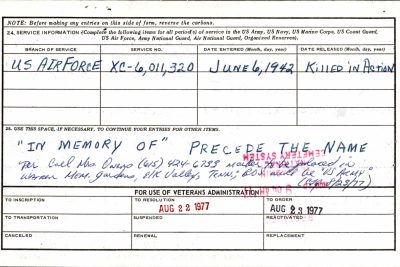 - Service Branch: Army/Army Air Forces