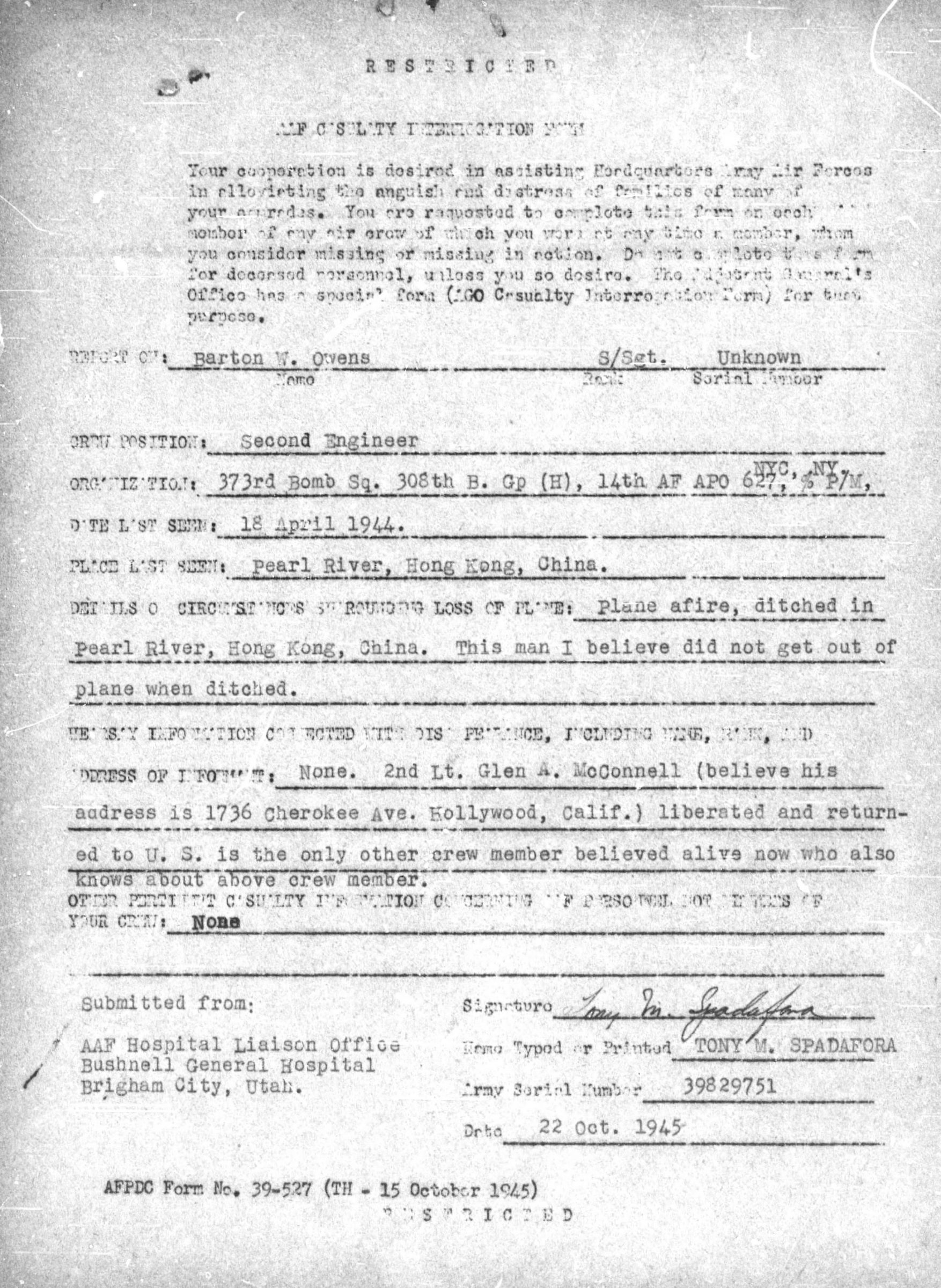 The plane was afire and ditched in the Pearl River, Hong Kong, China. It is believed that Barton Owens did not get out of the plane when it ditched.